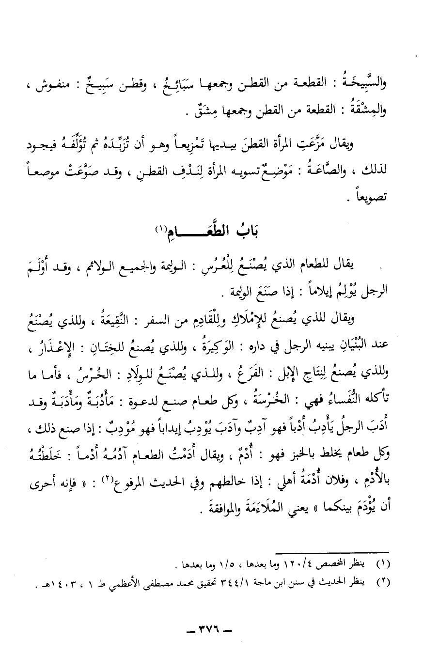 ويقال للذي يُصنعُ للإِمْلاكِ وللقادم من السَّفَرِ: النَّقِيعَةُ، وللذي يُصنع عند البُنْيَانِ يبنيه الرجل في داره: الوَكِيرَةُ، وللذي يُصنع للخِتَانِ: الإِعْذَارُ، وللذي يُصنع لنِتَاجِ الإبلِ: الفَرَعُ، وللذي يُصنعُ للوِلادِ: الخُرْسُ، فأما ما تأكله النُّفَسَاءُ فهي: الخُرْسَةُ، وكل طعام صُنع لدعوةٍ: مَادُبَةٌ ومَادَبَةٌ وقد أَدَبَ الرجلُ يَادِبُ أَدَبًا فهو آدِبٌ، وآدَبَ يُودِبُ إِيدَابًا فهو مُودِبٌ: إذا صنع ذلك، وكل طعام يُخلط بالخبز فهو: أُدْمٌ، ويقال أَدَمْتُ الطعام آدُمُهُ أَدْمًا: خَلَطْتُهُ بالأُدْمِ، وفلان أُدْمَةُ أهلي: إذا خالطهم، وفي الحديث المرفوع: "فإنه أحرى أن يُؤْدَمَ بينكما" يعني المُلاءَمَةَ والمُوَافَقَةَ.