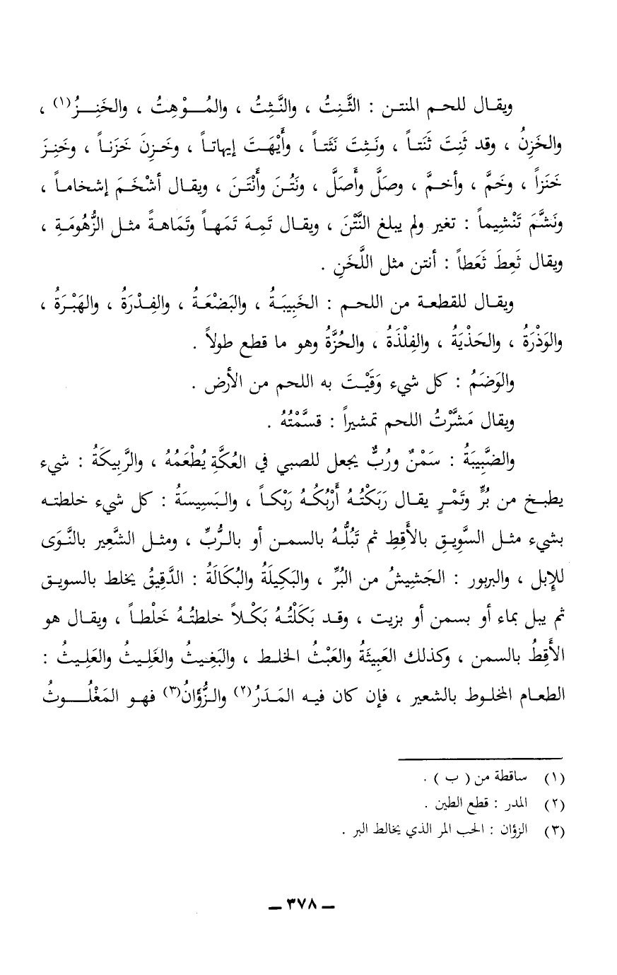 والضَّبِيبَةُ: سَمْنٌ وَرُبٌّ يُجعل للصبي في العُكَّةِ يُطْعَمُهُ، والرَّبِيكَةُ: شيء يُطبخ من بُرٍّ وتَمْرٍ يقال رَبَكْتُهُ أَرْبُكُهُ رَبْكًا، والبَسِيسَةُ: كل شيء خلطته بشيء مثل السَّوِيقِ بالأَقِطِ ثم تَبُلُّهُ بالسَّمن أو بالرُّبِّ، ومثل الشَّعِيرِ بالنَّوَى للإبل، والبربور: الجَشِيشُ من البُرِّ، والبَكِيلَةُ والبُكَالَةُ: الدَّقِيقُ يُخلط بالسويق ثم يُبَلُّ بماءٍ أو بسَمنٍ أو بزيتٍ، وقد بَكَلْتُهُ بَكْلًا خلطتُهُ خَلْطًا، ويقال هو الأَقِطُ بالسمن، وكذلك العَبِيثَةُ والعَبْثُ الخلط، والبَغِيثُ والغَلِيثُ والعَلِيثُ: الطعام المخلوط بالشعير، فإن كان فيه المَدَرُ والزُّؤَانُ فهو المَغْلُوثُ