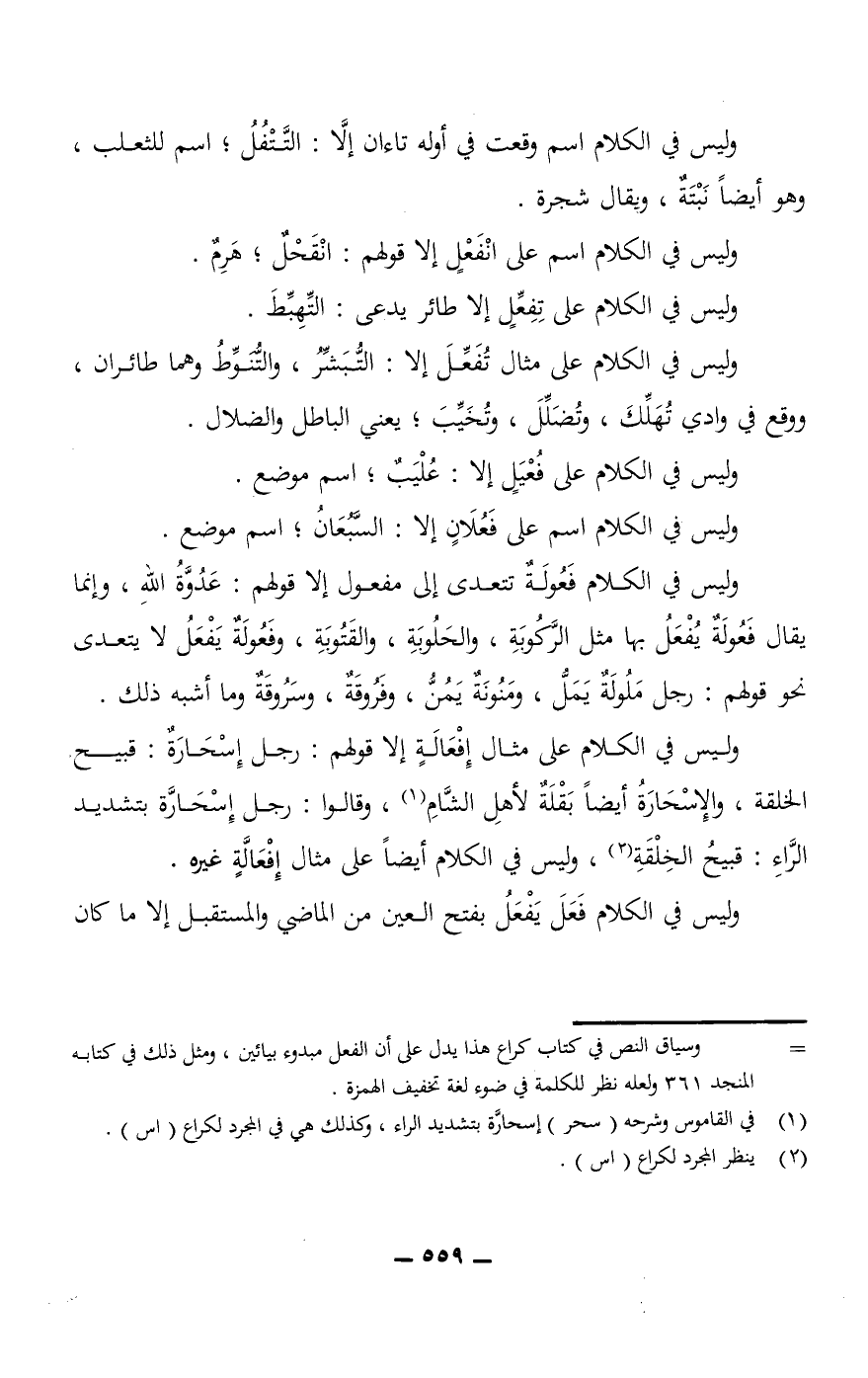 وليس في الكلام على مثال تُفَعِّلَ إلا: التُّبَشِّرُ، والتُّنَوِّطُ وهما طائران ووقع في وادي تُهلِّك، وتُضَلِّلَ، وتُخَيِّبَ؛ يعني الباطل والضلال.