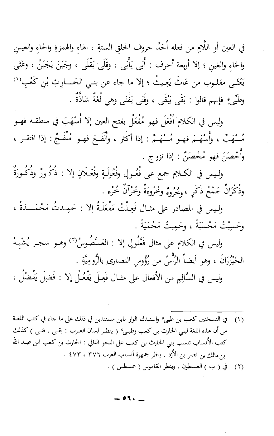 وليس في الكلام على مثال فَعَّلُولٍ إلا: العسَّطُوسُ وهو شجر يُشْبِهُ الخَيْزُرَانَ، وهو أيضًا الرأس من رءوس النصارى بالرُّومِيَّةِ. وليس في السالم من الأفعال على مثال فَعِلَ يَفْعُلُ إلا: فَضِلَ يَفْضُلُ،