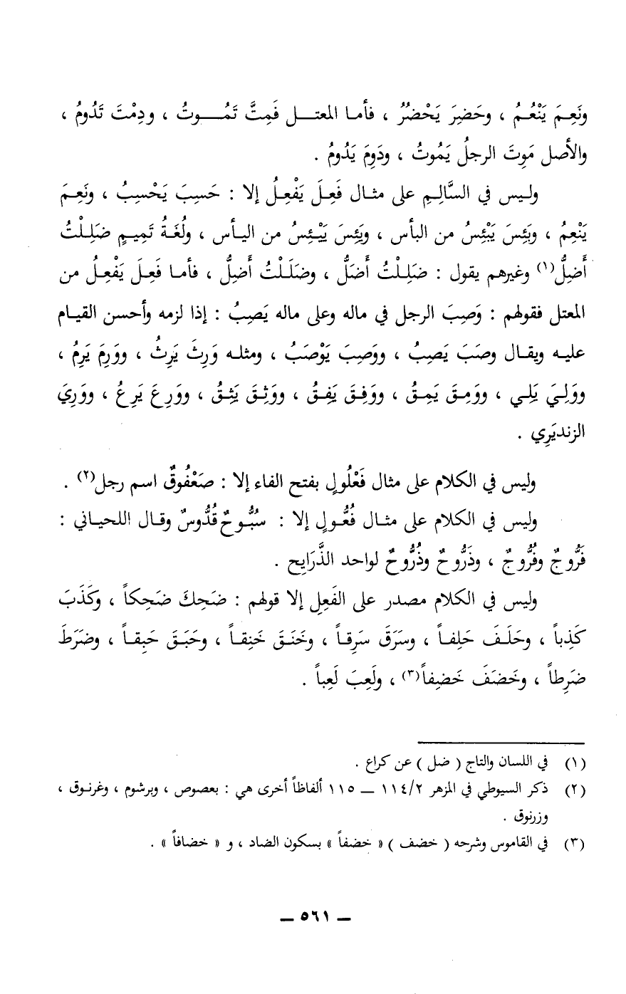 وليس في السَّالِمِ على مثال فَعِلَ يَفْعِلُ إلا: حَسِبَ يَحْسِبُ، ونَعِمَ يَنْعِمُ، وبَئِسَ يَبْئِسُ من البأس، ويَئِسَ يَيْئِسُ من اليأس، ولُغَةُ تَمِيمٍ ضَلِلْتُ أَضِلُّ وغيرهم يقول: ضَلِلْتُ أَضَلُّ، وضَلَلْتُ أَضِلُّ، فأما فَعِلَ يَفْعِلُ من المعتل فقولهم: وَصِبَ الرجل في ماله وعلى ماله يَصِبُ: إذا لزمه وأحسن القيام عليه ويقال: وصَبَ يَصِبُ، ووَصِبَ يَوْصَبُ، ومثله وَرِثَ يَرِثُ، ووَرِمَ يَرِمُ، ووَلِيَ يَلِي، ووَمِقَ يَمِقُ، ووَفِقَ يَفِقُ، ووَثِقَ يَثِقُ، ووَرِعَ يَرِعُ، ووَرِيَ الزنديَرِي.