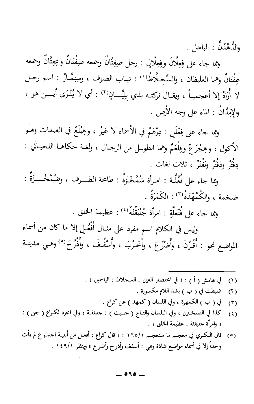 ومما جاء على فِعِلَّانَ وفِعِلَّالٍ: رجل صِفِتَّانٌ وجمعه صِفْتَانٌ وعِفِتَّانٌ وجمعه عِفْتَانٌ وهما الغليظان، والسِّجِلَّاطُ: ثياب الصوف، وسِنِمَّارٌ: اسم رجل لا أَرَاهُ إلا أعجميًا، ويقال تركته بذي بِلِيَّانٍ: أي لا يُدْرَى أين هو، والإِمِدَّانُ: الماء على وجه الأرض.