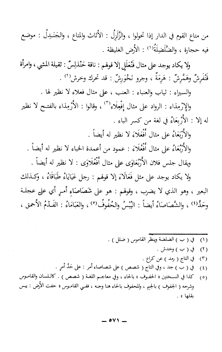 ولا يكاد يوجد على مثال فَنْعَلَلٍ إلا قولهم: ناقة حَنْدَلِسٌ: ثقيلة المشي، وامرأة قَنْفَرِشٌ وهَمَّرِشٌ: هَرِمَةٌ، وجرو نَخْوَرِشٌ: قد تحرك وخرش. والسيراء: ثياب والعنباء: العنب، على مثال فعلاء لا نظير لها.
