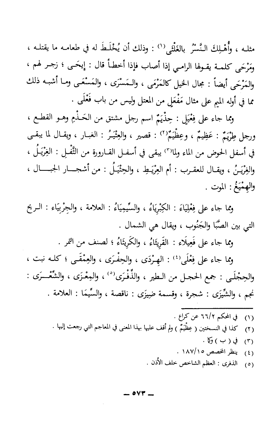 ومما جاء على فِعْيَلٍ: حِذْيَمٌ اسم رجل مشتق من الحَذْمِ وهو القطع، ورجل طِرْيَمٌ: عَظِيمٌ، وعِظْيَمٌ: قصير، والعِثْيَرُ: الغبار، ويقال لما يبقى في أسفل الحوض من الماء ولما يبقى في أسفل القارورة من الثَّفْلِ: الغِرْيَلُ، والغِرْيَنُ، ويقال للعقرب: أم العِرْيَطِ، والحِثْيَلُ: من أشجار الجبال، والهِمْيَغُ: الموت.