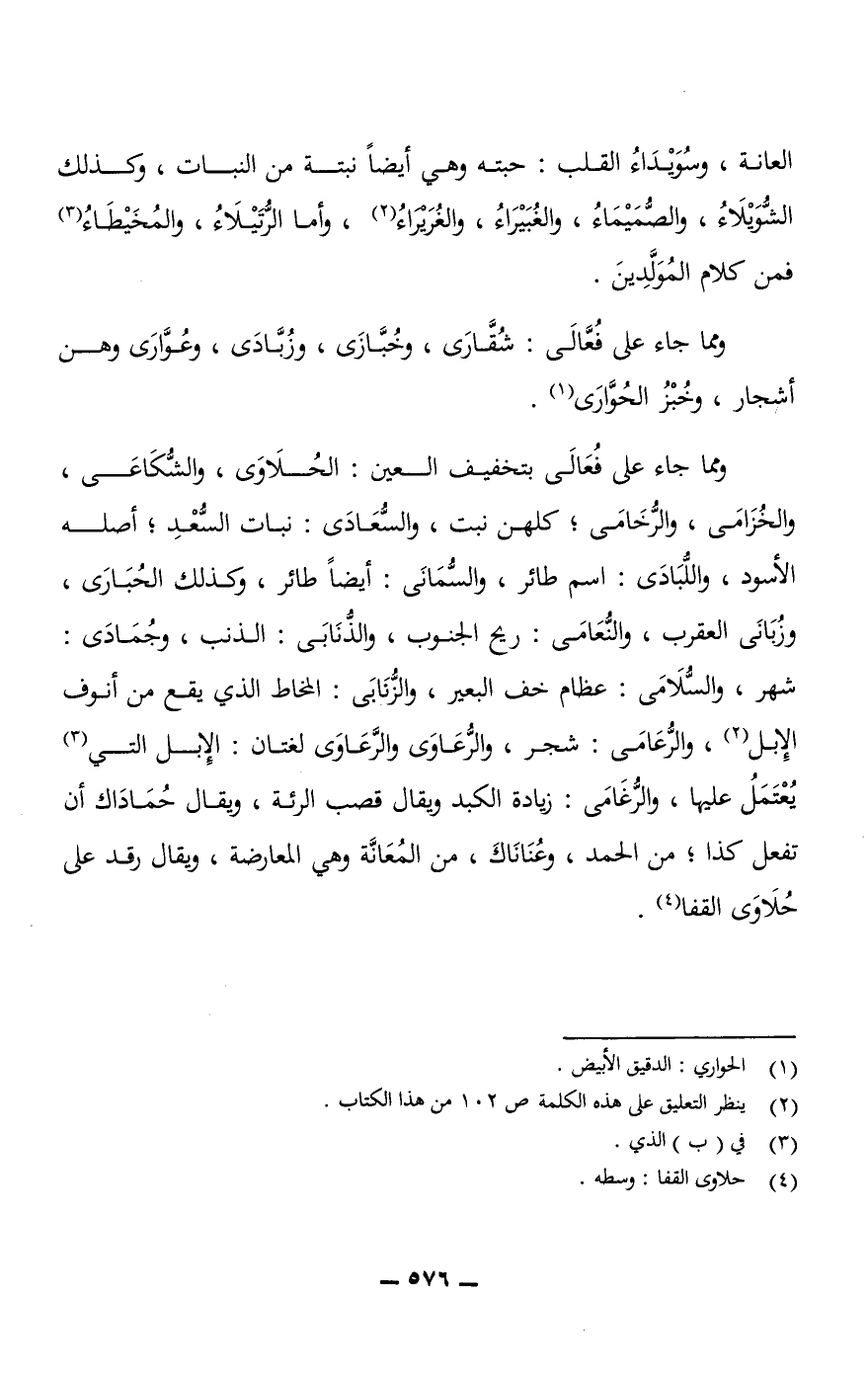 ومما جاء على فُعَّالَى: شُقَّارَى، وخُبَّازَى، وزُبَّادَى، وعُوَّارَى وهن أشجار، وخُبْزُ الحُوَّارَى.