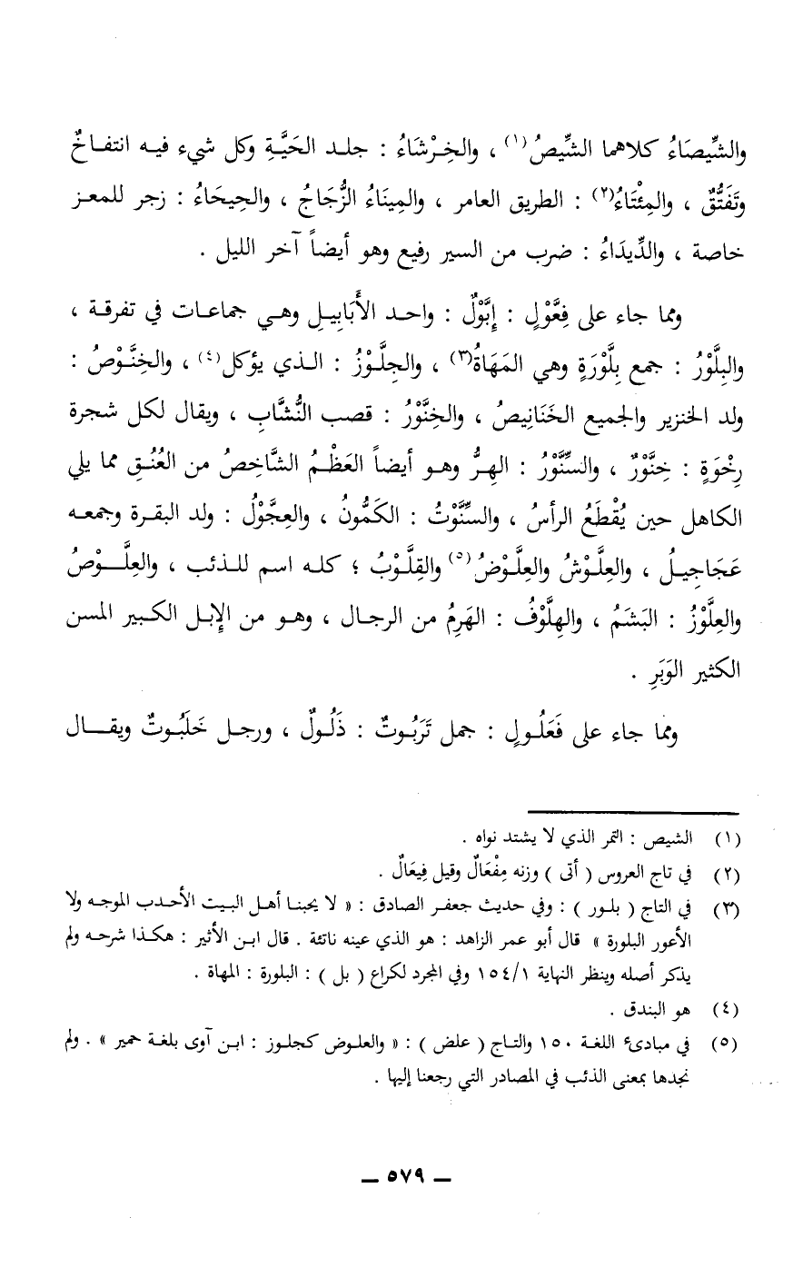 ومما جاء على فِعَّوْلٍ: إِبَّوْلٌ: واحد الأبابيل وهي جماعات في تفرقة، والبِلَّوْرُ: جمع بِلَّوْرَة وهي المَهَاةُ، والجِلَّوْزُ: الذي يؤكل، والخِنَّوْصُ: ولد الخنزير والجميع الخَنَانِيصُ، والخِنَّوْرُ: قصب النُّشَّابِ، ويقال لكل شجرة رِخْوَةٍ: خِنَّوْرٌ، والسِّنَّوْرُ: الهِرُّ وهو أيضًا العَظْمُ الشَّاخِصُ من العُنُقِ مما يلي الكاهل حين يُقْطَعُ الرأسُ، والسِّنَّوْتُ: الكَمُّونُ، والعِجَّوْلُ: ولد البقرة وجمعه عَجَاجِيلُ، والعِلَّوْشُ والعِلَّوْضُ والقِلَّوْبُ؛ كله اسم للذئب، والعِلَّوْصُ والعِلَّوْزُ: البَشَمُ، والهِلَّوْفُ: الهَرِمُ من الرجال، وهو من الإبل الكبير المسن الكثير الوبر. ومما جاء على فَعَلُولٍ: جمل تَرَبُوتٌ: ذَلُولٌ، ورجل خَلَبُوتٌ ويقال