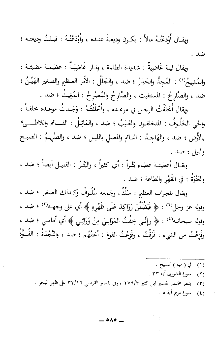 ويقال ليلة غَاضِيَةٌ: شديدة الظلمة، ونار غَاضِيَةٌ: عظيمة مضيئة، والمُشِيحُ: المُجِدُّ والحَذِرُ؛ ضد، والجَلَلُ: الأمر العظيم والصغير الهَيِّنُ؛ ضد، والصَّارِخُ: المستغيث، والصَّارِخُ والمُصْرِخُ: المُغِيثُ؛ ضد.