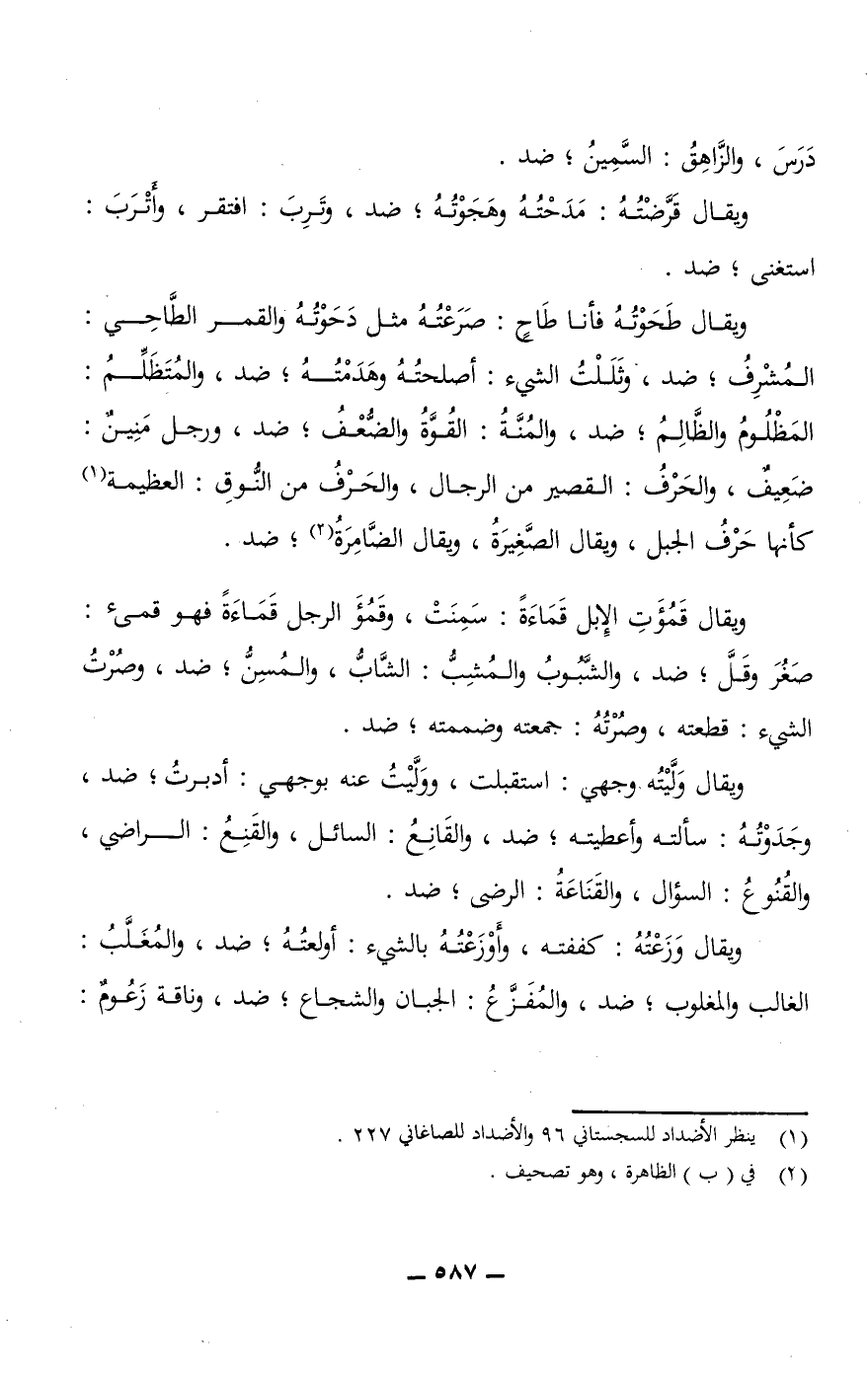 ويقال طَحَوْتُهُ فأنا طاحٍ: صَرَعْتُهُ مثل دَحَوْتُهُ والقمر الطَّاحِي: المُشْرِفُ؛ ضد، وثَلَلْتُ الشيء: أصلحتُهُ وهَدَمْتُهُ؛ ضد، والمُتَظَلِّمُ: المَظْلُومُ والظَّالِمُ؛ ضد، والمُنَّةُ: القُوَّةُ والضُّعْفُ؛ ضد، ورجل مَنِينٌ: ضَعِيفٌ، والحَرْفُ: القصير من الرجال، والحَرْفُ من النُّوقِ العظيمة كأنها حَرْفُ الجبل، ويقال الصَّغِيرَةُ، ويقال الضَّامِرَةُ؛ ضد.