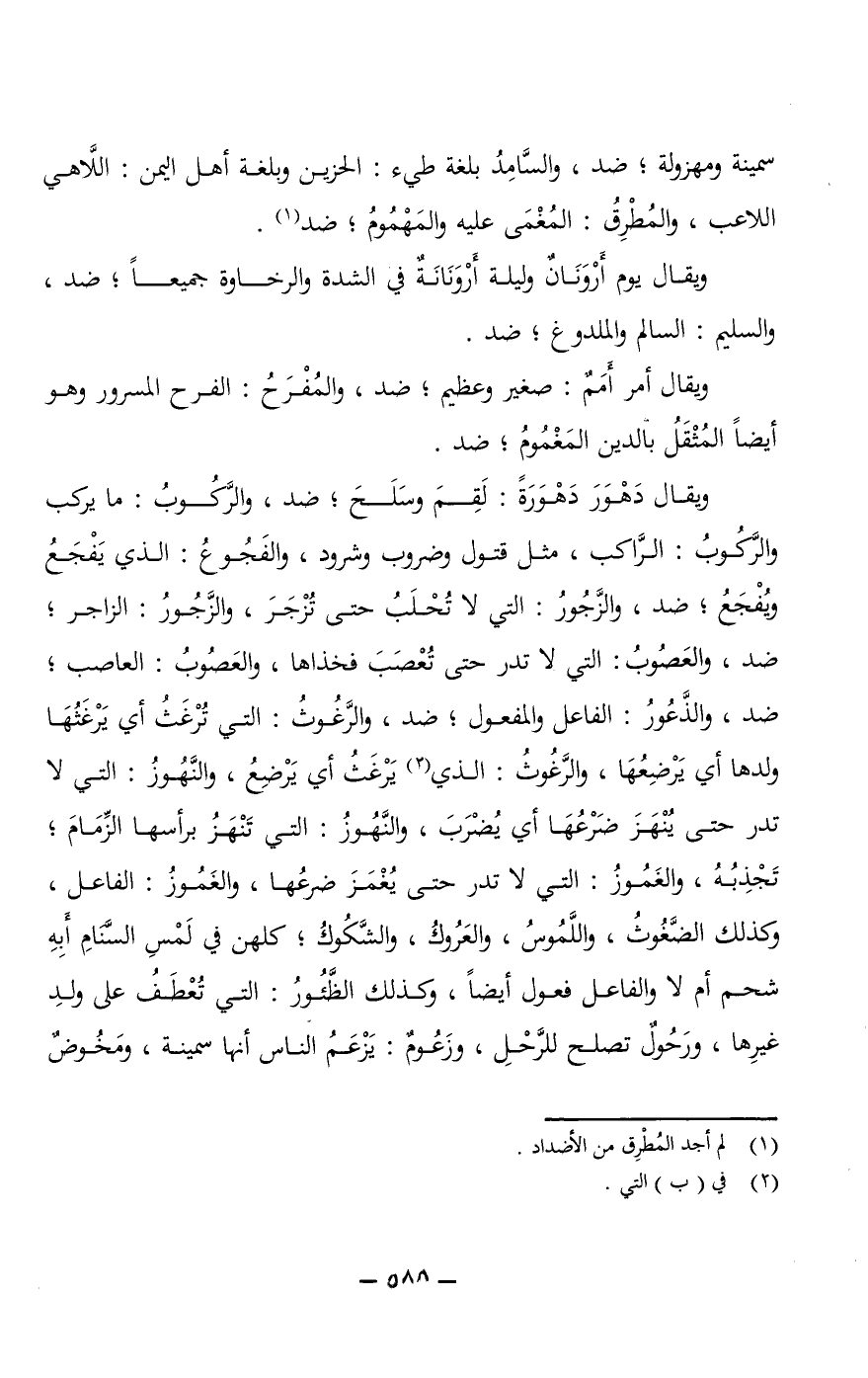 سمينة ومهزولة؛ ضد، والسَّامِدُ بلغة طيء: الحزين وبلغة أهل اليمن: اللَّاهي اللاعب، والمُطْرِقُ: المُغْمَى عليه والمَهْمُومُ؛ ضد. ويقال يوم أَرْوَنَانٌ وليلة أَرْوَنَانَةٌ في الشدة والرخاوة جميعًا؛ ضد والسليم: السالم والملدوغ؛ ضد.
