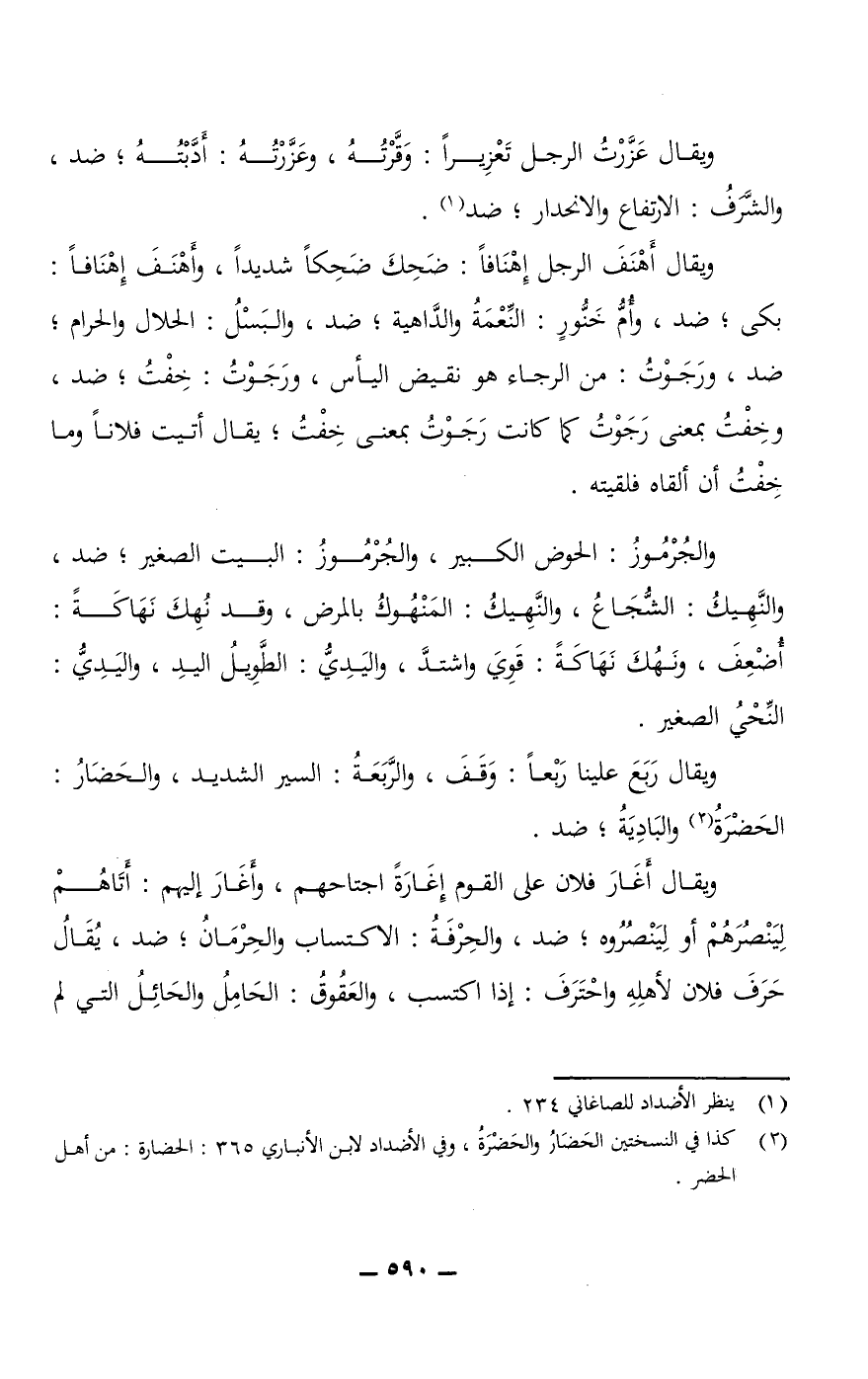 ويقال أَهْنَفَ الرجل إِهْنَافًا: ضَحِكَ ضَحِكًا شديدًا، وأَهْنَفَ إِهْنَافًا: بكى؛ ضد، وأُمُّ خَنُّورِ: النِّعْمَةُ والدَّاهية؛ ضد، والبَسْلُ: الحلال والحرام؛ ضد، ورَجَوْتُ: من الرجاء هو نقيض اليأس، ورَجَوْتُ: خِفْتُ؛ ضد، وخِفْتُ بمعنى رَجَوْتُ كما كانت رَجَوْتُ بمعنى خِفْتُ؛ يقال أتيت فلانًا وما خِفْتُ أن ألقاه فلقيته. والجُرْمُوزُ: الحوض الكبير، والجُرْمُوزُ: البيت الصغير؛ ضد، والنَّهِيكُ: الشُّجَاعُ، والنَّهِيكُ: المَنْهُوكُ بالمرض، وقد نُهِكَ نَهَاكَةً: أُضْعِفَ، ونَهُكَ نَهَاكَةً: قَوِيَ واشتدَّ، واليَدِيُّ: الطويل اليدِ، واليَدِيُّ: النِّحْيُ الصغير.
