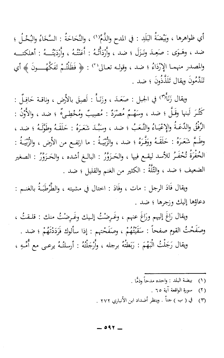 أي ظواهرها، وبَيْضَةُ البَلَدِ: في المدح والذَّمِّ، والنَّحَاحَةُ: السَّخَاءُ والبُخْلُ؛ ضد، وهَوَى: صَعِدَ ونَزَلَ؛ ضد، أَرْدَاتُهُ: أَعَنْتُهُ، وأَرْدَيْتُهُ: أهلكته والمصدر منهما الإرْدَاءُ؛ ضد، وقوله تعالى: {فَظَلْتُمْ تَفَكَّهُونَ} أي: تندمون، ويقال تلذذون؛ ضد.