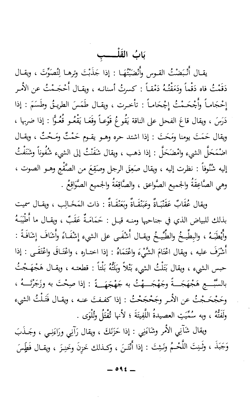 يقال أَنْبَضْتُ القوس وأَنْضَبْتُهَا: إذا جَذَبْتَ وترها لِتُصوِّتَ، ويقال دَقَمْتُ فاه دقمًا وَدَمَقْتُهُ دمقًا: كسرتُ أسنانه، ويقال أَحْجَمْتُ عن الأمر إحجامًا وأَجْحَمْتُ إجحامًا: تأخرت، ويقال طَمَسَ الطريق وطَسَمَ: إذا دَرَسَ، ويقال قاعَ الفحل على الناقة يَقُوعُ قَوْعًا وقَعَا يَقْعُو قُعُوًّا: إذا ضربها، ويقال حَمَتَ يومًا وَمَحَتَ: إذا اشتد حره وهو يقوم حَمْتٌ ومَحْتٌ، ويقال اضْمَحَلَّ الشيء وامْضَحَلَّ: إذا ذهب، ويقال شَفَنْتُ إلى الشيء شُفُونًا وشَنَفْتُ إليه شُنُوفًا: نظرت إليه، ويقال صَعِقَ الرجل وصَقِعَ من الصَّقْعِ وهو الصوت، وهي الصَّاعِقَةُ والجميع الصَّواعق، والصَّاقِعَةُ والجميع الصَّوَاقِعُ. ويقال عُقَابٌ عَقَنْبَاةٌ وعَبَنْقَاةٌ وبَعَنْقَاةٌ: ذات المَخَالبِ، ويقال سميت بذلك للبياض الذي في جناحها ومنه قيل: حَمَامَةٌ عَقَبٌ، ويقال ما أَطْيَبَهُ وأَيْطَبَهُ، والبِطِّيخُ والطِّبِّيخُ ويقال أَشْفَى على الشيء إِشْفَاءً وأَشَافَ إِشَافَةً: أَشْرَفَ عليه، ويقال اعْتَامَ الشيء واعْتَمَاهُ: إذا اختاره، واعْتَاقَ واعْتَقَى: إذا حبس الشيء، ويقال بَتَلْتُ الشيء بَتْلًا وبَلَتُّهُ بَلْتًا: قطعته، ويقال هَجْهَجْتُ بالسَّبْعِ هَجْهَجَةً وجَهْجَهْتُ به جَهْجَهَةً: إذا صِحْتَ به وزَجَرْتَهُ، وحَجْحَجْتُ عن الأمر وجَحْجَحْتُ: إذا كففت عنه، ويقال فَتَلْتُ الشيء ولَفَتُّهُ، وبه سُمِّيَتِ العصيدةُ اللَّفِيتَةَ؛ لأنها تُفْتَلُ وتُلْوَى.