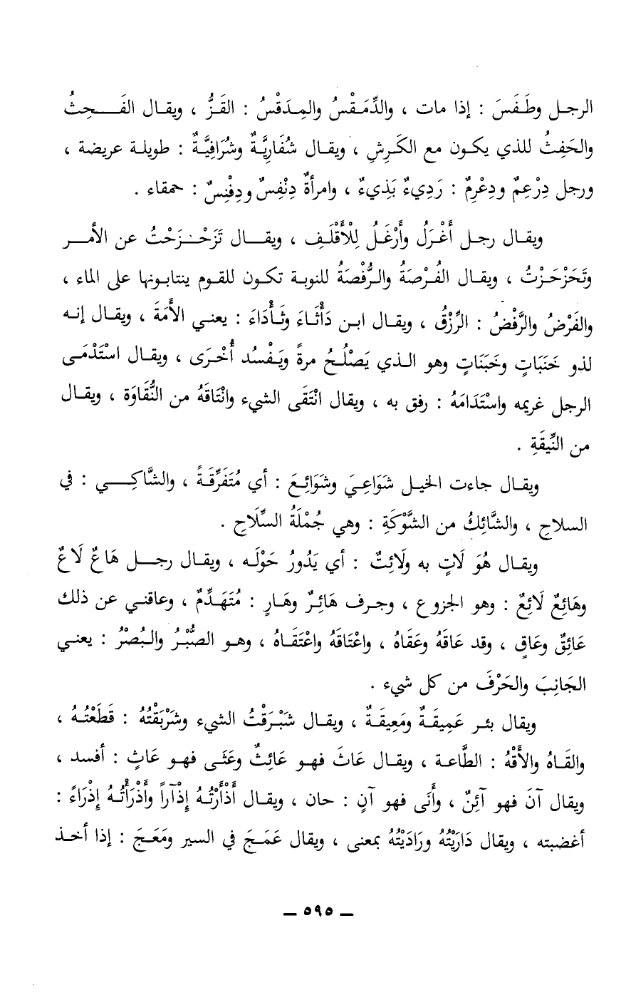 ويقال بئر عَمِيقَةٌ ومَعِيقَةٌ، ويقال شَبْرَقْتُ الشيء وشَرْبَقْتُهُ: قَطَعْتُهُ، والقَاهُ والأَقْهُ: الطاعة، ويقال عَاثَ فهو عَائِثٌ وعَثَى فهو عَاثٍ: أفسد، ويقال آن فهو آئِنٌ، وأَنَى فهو آنٍ: حان، ويقال أَذْأَرْتُهُ إذْآرًا وأَذْرَاتُهُ إذْرَاءً: أغضبته، ويقال دَارَيْتُهُ ورَادَيْتُهُ بمعنى، ويقال عَمَجَ في السير وَمَعَجَ: إذا أخذ