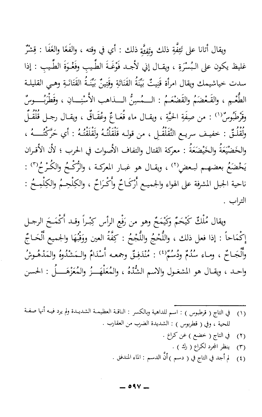 ويقال أتانا على تَئِفَّةِ ذلك وتَفِئَّةِ ذلك: أي في وقته، والفَغَا والغَفَا: قِشْرٌ غليظ يكون على البُسْرَةِ، ويقال إني لأجد فَوْغَةَ الطِّيبِ وفَغْوَةَ الطِّيبِ: إذا سدت خياشمك ويقال امرأة قَنِيتٌ بَيِّنَةُ القَنَاتَةِ وقَتِينٌ بَيِّنَةُ القَتَانَةِ وهي القليلة الطُّعْمِ، والقَعْضَمُ والقَضْعَمُ: المُسِنُّ الذاهب الأسْنِانِ، وقَطْرَبُوسٌ وقَرْطَبُوسٌ: من صِفَةِ الحيَّةِ، ويقال ماء قُعَاعٌ وعُقَاقٌ، ويقال رجل قُلْقُلٌ ولُقْلُقٌ: خفيف سريع التَّقَلْقُلِ، من قوله قَلْقَلْتُهُ ولَقْلَقْتُهُ: أي حَرَّكْتُهُ، والخَضْيَعَةُ والخَيْضَعَةُ: معركة القتال والتفاف الأصوات في الحرب؛ لأن الأقران يَخْضَعُ بعضهم لبعض، ويقال هو غبار المعركة، والرُّكْعُ والكُرْحُ: ناحية الجبل المشرفة على الهواء والجميع أَرْكَاحٌ وأَكْرَاحٌ، والكِلْحِمُ والكِلْمِحُ: التراب.