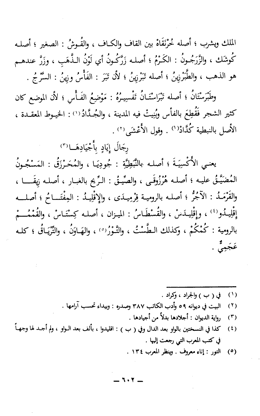 الملك ويشرب؛ أصله خُرْنَقَاهْ بين القاف والكاف، والقُوشُ: الصغير؛ أصله كُوشَك، والزَّرَجُونُ: الكَرْمُ؛ أصله زَرَّكُونُ أي لَوْنُ الذَّهَبِ، وزَرَّ عندهم هو الذهب، والطَّبَرْزِينُ؛ أصله تَبْرزِينُ؛ لأن تَبَرَ: الفَاسُ وزِينُ: السَّرْجُ.