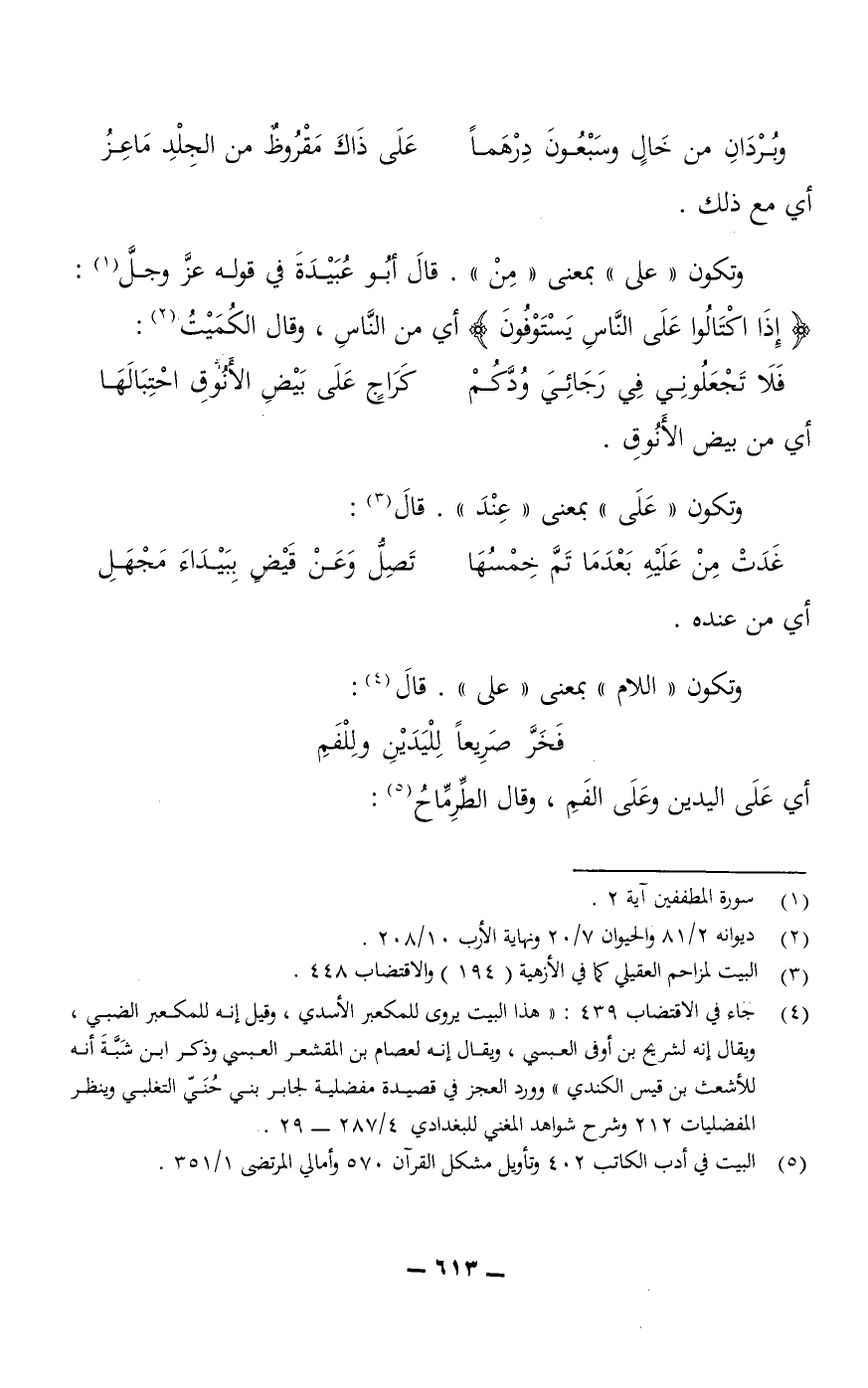 قَالَ أَبُو عُبَيْدَةَ في قوله عزَّ وَجلَّ: {إِذَا اكْتَالُوا عَلَى النَّاسِ يَسْتَوْفُونَ} أي: من الناس، وقال الكُمَيْتُ: