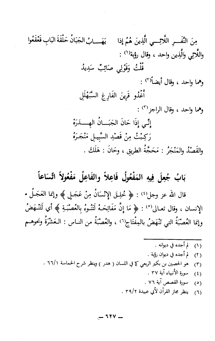 قال الله عز وجل: {خُلِقَ الإِنْسَانُ مِنْ عَجَلٍ} وإنما العَجَلُ الإنسان، وقال تعالى: {مَا إِنَّ مَفَاتِحَهُ لَتَنُوءُ بِالعُصْبَةِ} أي لَتَنْهَضُ وإنما العُصْبَةُ التي تَنْهَضُ بالمِفْتَاحِ، والعُصْبَةُ من الناس: العَشْرَةُ ونحوهم