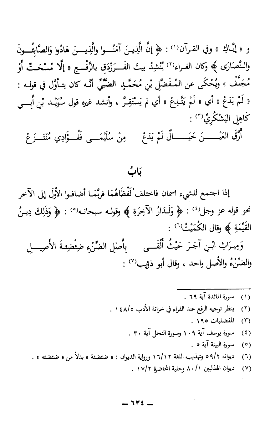 و"إياك" وفي القرآن: {إِنَّ الَّذِينَ آمَنُوا والَّذِينَ هَادُوا وَالصَّابِئُونَ والنَّصَارَى} وكان الفراء يُنْشِدُ بيتَ الفَرَزْدَق بالرَّفْعِ إِلَّا مُسْحَتٌ أو مُجَلَّفُ، ويُحكى عن المفضل بن محمد الضبي أنه كان يتأوَّل في قوله: لَمْ يَدَعْ أي لَمْ يَتَّدِعْ؛ أي: لم يستقر، وأنشد غيره قول سُوَيْد بْنِ أبِي كَاهِلٍ اليَشْكُرِيِّ: