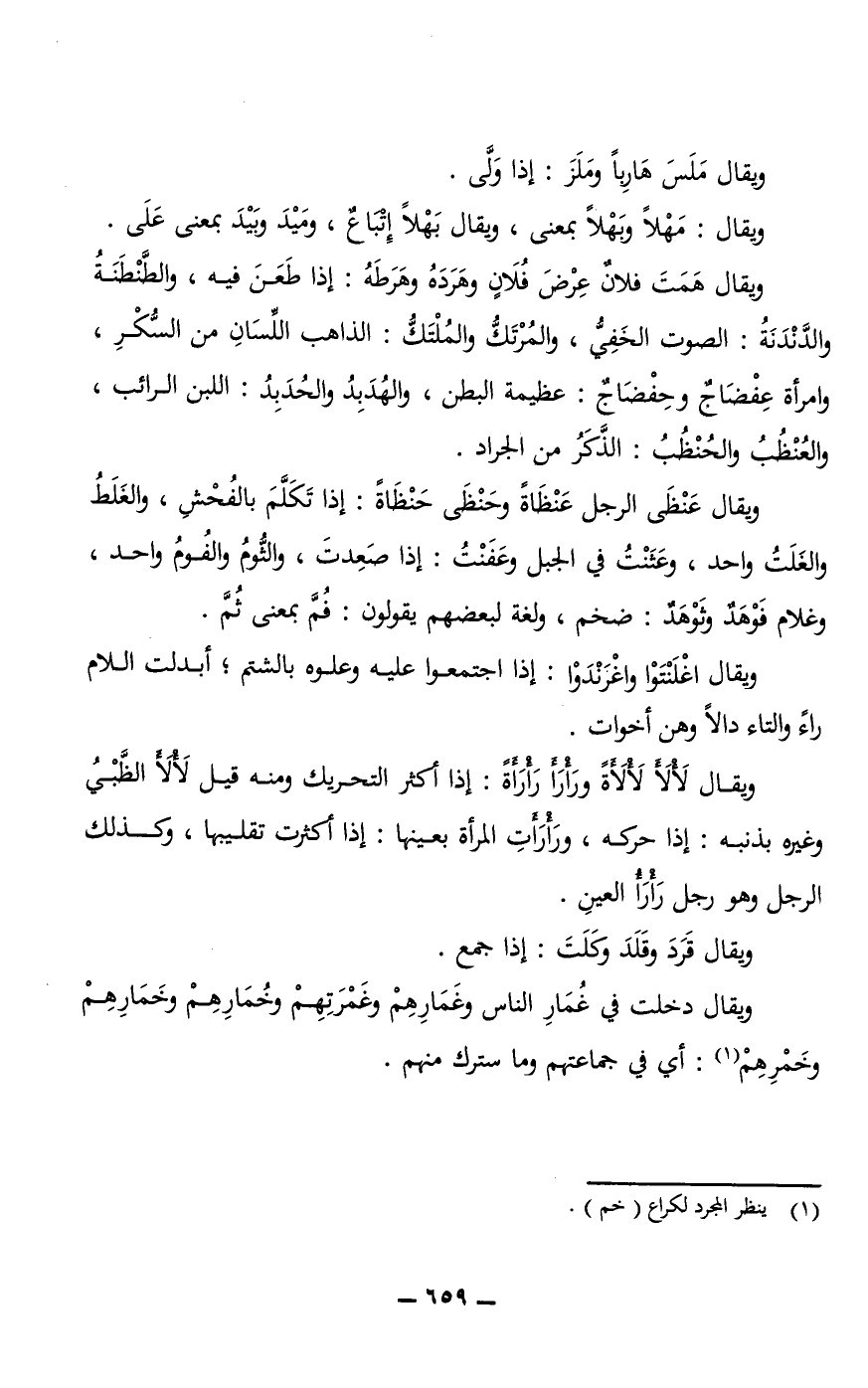 ويقال هَمَتَ فلانٌ عِرْضَ فُلَانٍ وهَرَدَهُ وهَرَطَهُ: إذا طَعَنَ فيه، والطَّنْطَنَةُ والدَّنْدَنَةُ: الصوت الخَفِيُّ، والمُرْتَكُّ والمُلْتَكُّ: الذهاب اللِّسَانِ من السُّكْرِ، وامرأة عِفْضَاجٌ وحِفْضَاجٌ: عظيمة البطن، والهُدَبِدُ والحُدَبِدُ: اللبن الرائب، والعُنْظُبُ والحُنْظُبُ: الذَّكَرُ من الجراد.