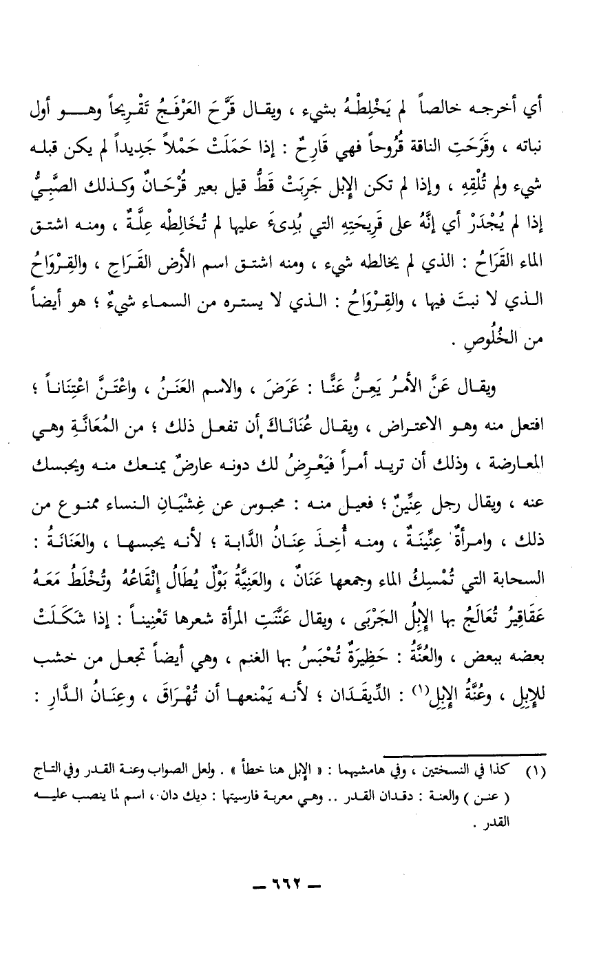 ويقال عَنَّ الأمرُ يَعِنُّ عَنَّا: عَرَضَ، والاسم العَنَنُ، واعتنَّ اعْتِنَانًا؛ افتعل منه وهو الاعتراض، ويقال عُنَانَاكَ أن تفعل ذلك؛ من المُعَانَّةِ وهي المعارضة، وذلك أن تريد أمرًا فيَعْرِضُ لك دونه عارضٌ يمنعك منه ويحبسك عنه، ويقال رجل عِنِّينٌ؛ فعيل منه: محبوس عن غِشْيَانِ النساء ممنوع من ذلك، وامرأةٌ عِنِّينَةٌ، ومنه أُخِذَ عِنَانُ الدَّابة؛ لأنه يحبسها، والعَنَانَةُ: السحابة التي تُمْسِكُ الماء وجمعها عَنَانٌ، والعَنِيَّةُ بَوْلٌ يُطَالُ إِنْقَاعُهُ وتُخْلَطُ مَعَهُ عَقَاقِيرُ تُعَالَجُ بها الإبل الجَرْبَى، ويقال عَنَّنَتِ المرأة شعرها تَعْنِينًا: إذا شَكَلَتْ بعضه ببعض، والعُنَّةُ: حَظِيرَةٌ تُحْبَسُ بها الغنم، وهي أيضًا تجعل من خشب للإبل، وعُنَّةُ الإبل: الدِّيقَدَان؛ لأنه يَمْنعها أن تُهْرَاقَ، وعِنَانُ الدَّارِ: