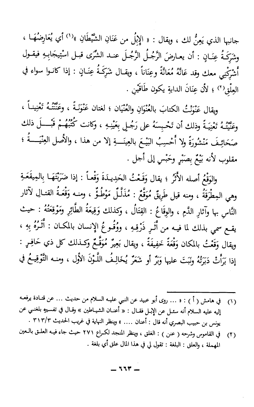 ويقال عَنْوَنْتُ الكتاب بالعُنْوَانِ والعُنْيَان؛ لغتان عَنْوَنَةً، وعَنَّنْتُهُ تَعْنِينًا، وعَنَّيْتُهُ تَعْنِيَةً وذلك أن تَحْبِسَهُ على رجل بعينه، وكانت كُتُبُهُمْ قبل ذلك صحائف منشورة ولا أحسب البيع بالعِينَةِ إلا من هذا، والأصل العِنْيَةُ؛ مقلوب لأنه بَيْعٌ بِصَبْرٍ وحَبْسٍ إلى أجل. د