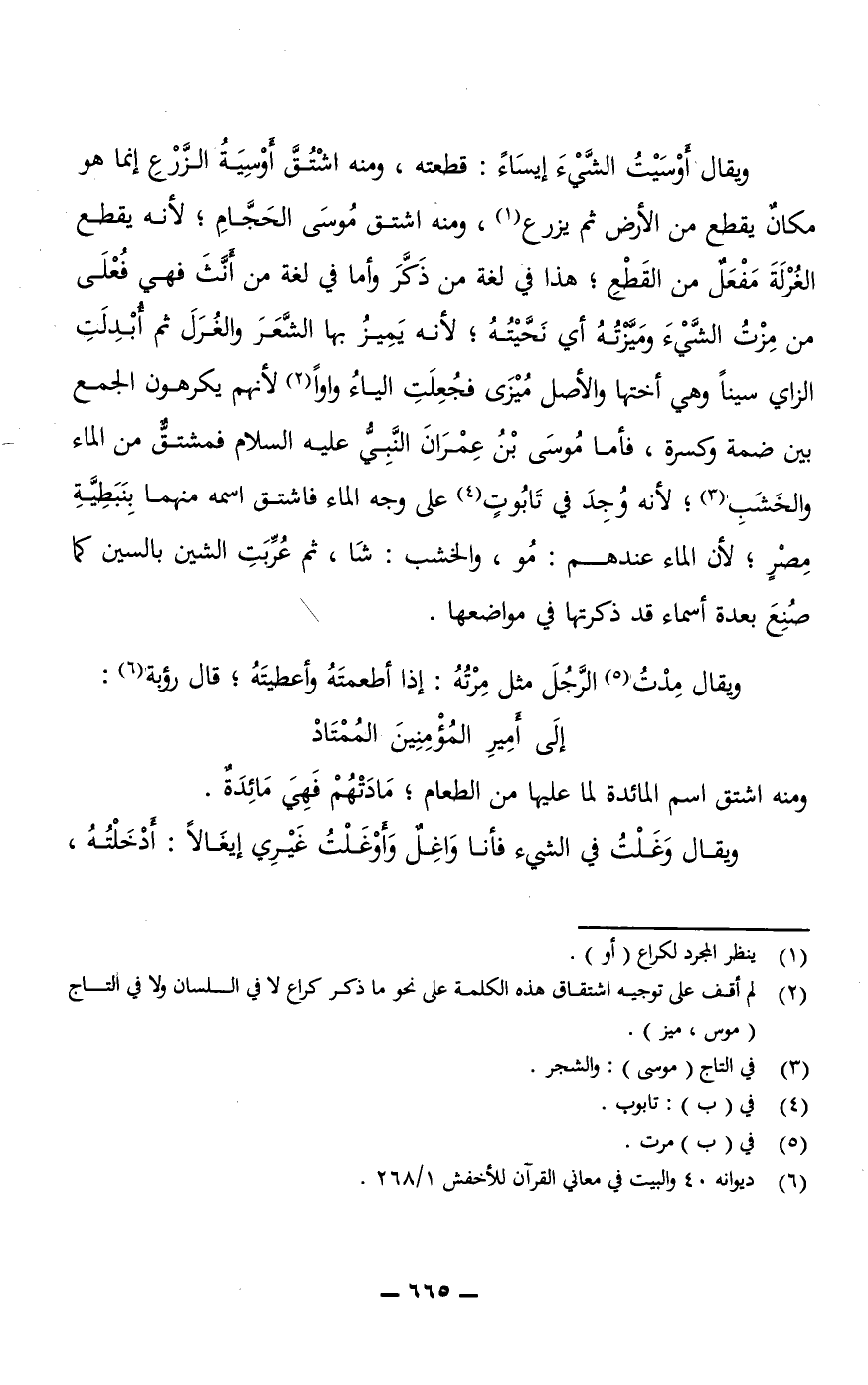 ويقال أَوْسَيْتُ الشَّيْءَ إِيسَاءً: قطعته، ومنه اشْتُقَّ أَوْسِيَةُ الزَّرْعِ إنما هو مكان يقطع من الأرض ثم يزرع، ومنه اشتق مُوسَى الحَجَّامِ؛ لأنه يقطع الغُرْلَةَ مَفْعَلٌ من القَطْعِ؛ هذا في لغة من ذَكَّرَ وأما في لغة من أَنَّثَ فهي فُعْلَى من مِزْتُ الشَّيء ومَيَّزْتُهُ أي نَحَّيْتُهُ؛ لأنه يَمِيزُ بها الشَّعَرَ والغُرَلَ ثم أُبدلت الزاي سينًا وهي أختها والأصل مُيْزَى فجُعِلَتِ الياءُ واوًا لأنهم يكرهون الجمع بين ضمة وكسرة، فأما مُوسَى بْنُ عِمْرَانَ النَّبِيُّ عليه السلام فمشتقٌ من الماء والخشب؛ لأنه وُجِدَ في تابُوت على وجه الماء فاشتق اسمه منهما بِنَبَطِيَّةِ مصر؛ لأن الماء عندهم: مُو، والخشب: شَا، ثم عُرِّبَتِ الشين بالسين كما صُنِعَ بعدة أسماء قد ذكرتها في مواضعها.