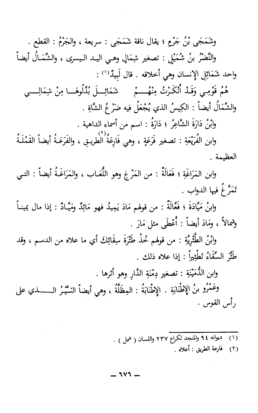 وابن الدُّمَيْنَةِ: تصغير دِمْنَةِ الدَّارِ وهو أثرها. وعَمْرُو بنُ الإِطْنَابَةِ. والإِطْنَابَةُ: المِظَلَّةُ، وهي أيضًا السَّيْرُ الذي على رأس القوس.