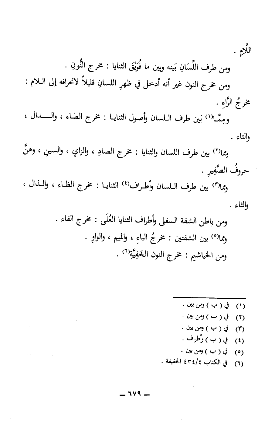 ومما بين طرف اللسان والثنايا: مخرج الصاد، والزاي، والسين، وهنَّ حروفُ الصَّفِيرِ. ومما بين طرف اللسان وأطراف الثنايا: مخرج الظاء، والذال، والثاء.