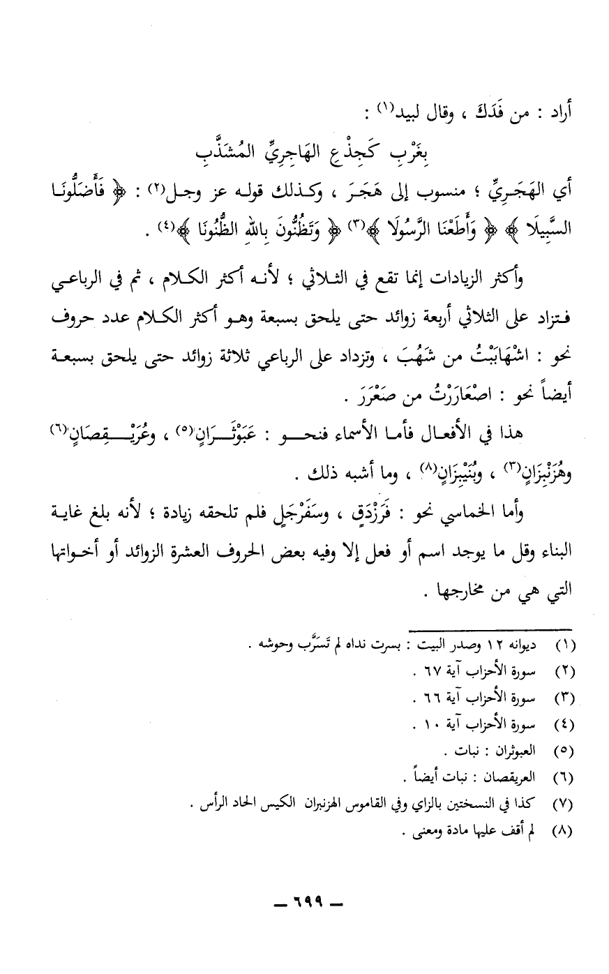 وأكثر الزيادات إنما تقع في الثلاثي؛ لأنه أكثر الكلام، ثم في الرباعي فتزاد على الثلاثي أربعة زوائد حتى يلحق بسبعة وهو أكثر الكلام عدد حروف نحو: اشْهَابَبْتُ من شَهُبَ، وتزاد على الرباعي ثلاثة زوائد حتى يلحق بسبعة أيضًا نحو: اصْعَارَرْتُ من صَعْرَرَ. هذا في الأفعال فأما الأسماء فنحو: عَبَوْثَرَانٍ، وعُرَيْقِصَانٍ وهُزَنْبِزَانٍ، وبُنَيْبَزانٍ، وما أشبه ذلك.