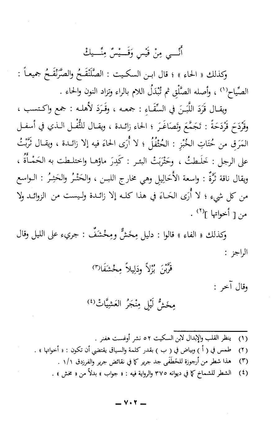 وكذلك الحاء؛ قال ابن السكيت: الصَّلَنْقَحُ والصَّرَنْقَحُ جميعًا: الصِّياح، وأصله الصَّلْقِ ثم تُبْدَلُ اللام بالراء وتزاد النون والحاء.