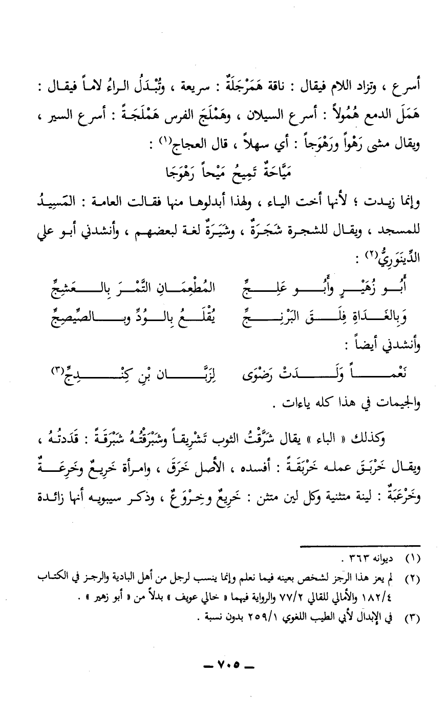 أسرع، وتزاد اللام فيقال: ناقة هَمَرْجَلَةٌ: سريعة، وتُبْدَلُ الرَّاء لامًا، فيقال: هَمَلَ الدمع هُمُولًا: أسرع السيلان، وهَمْلَجَ الفرس هَمْلَجَةً: أسرع السير، ويقال مشى رَهْوًا ورَهْوَجًا: أي سهلًا، قال العجاج: