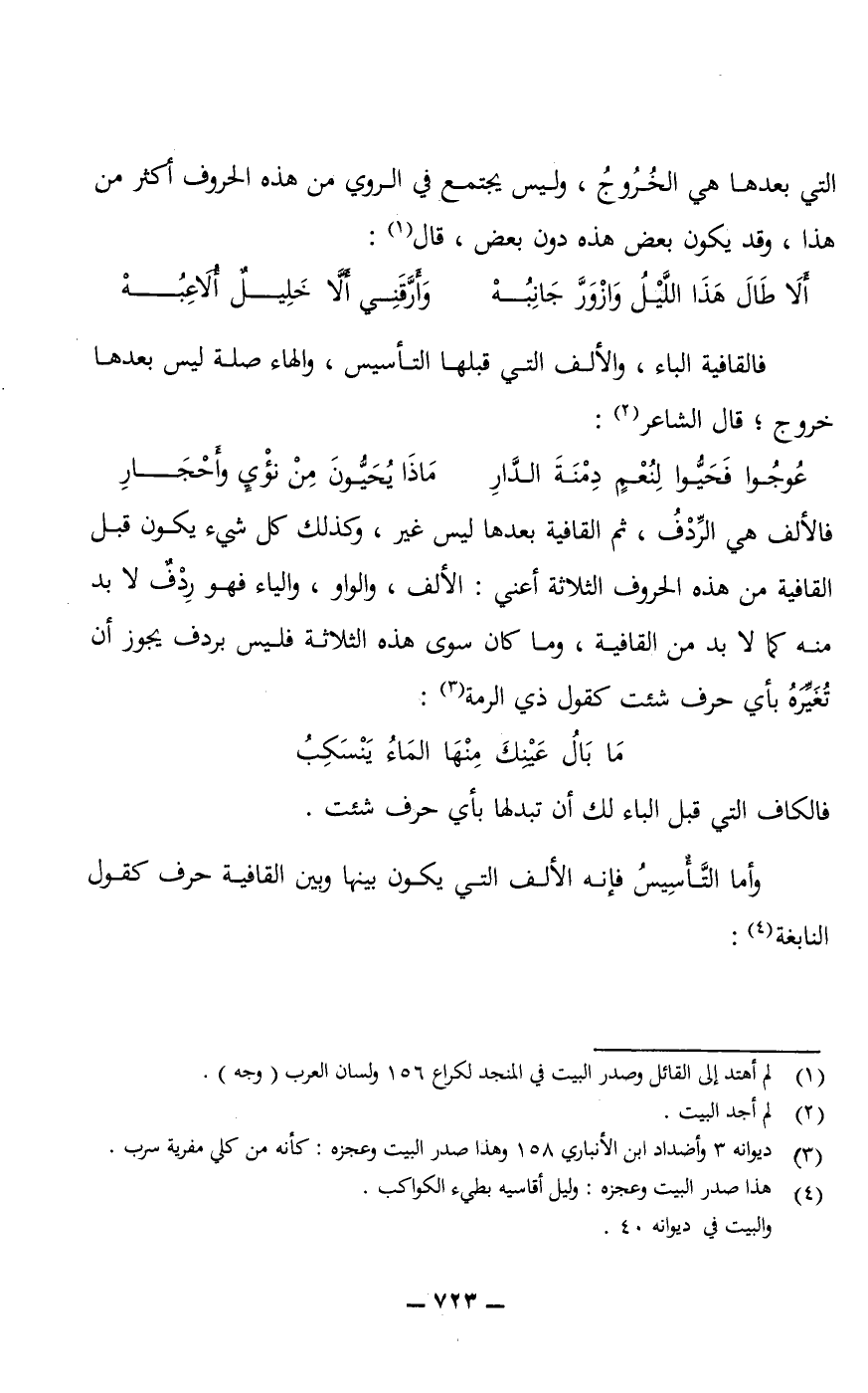 فالقافية الباء، والألف التي قبلها التأسيس، والهاء صلة ليس بعدها خروج؛ قال الشاعر: عُوجُوا فَحيُّوا لِنُعْمٍ دِمْنَةَ الدَّارِ ... مَاذَا يُحَيُّونَ مِنْ نؤْيٍ وأَحْجَارِ