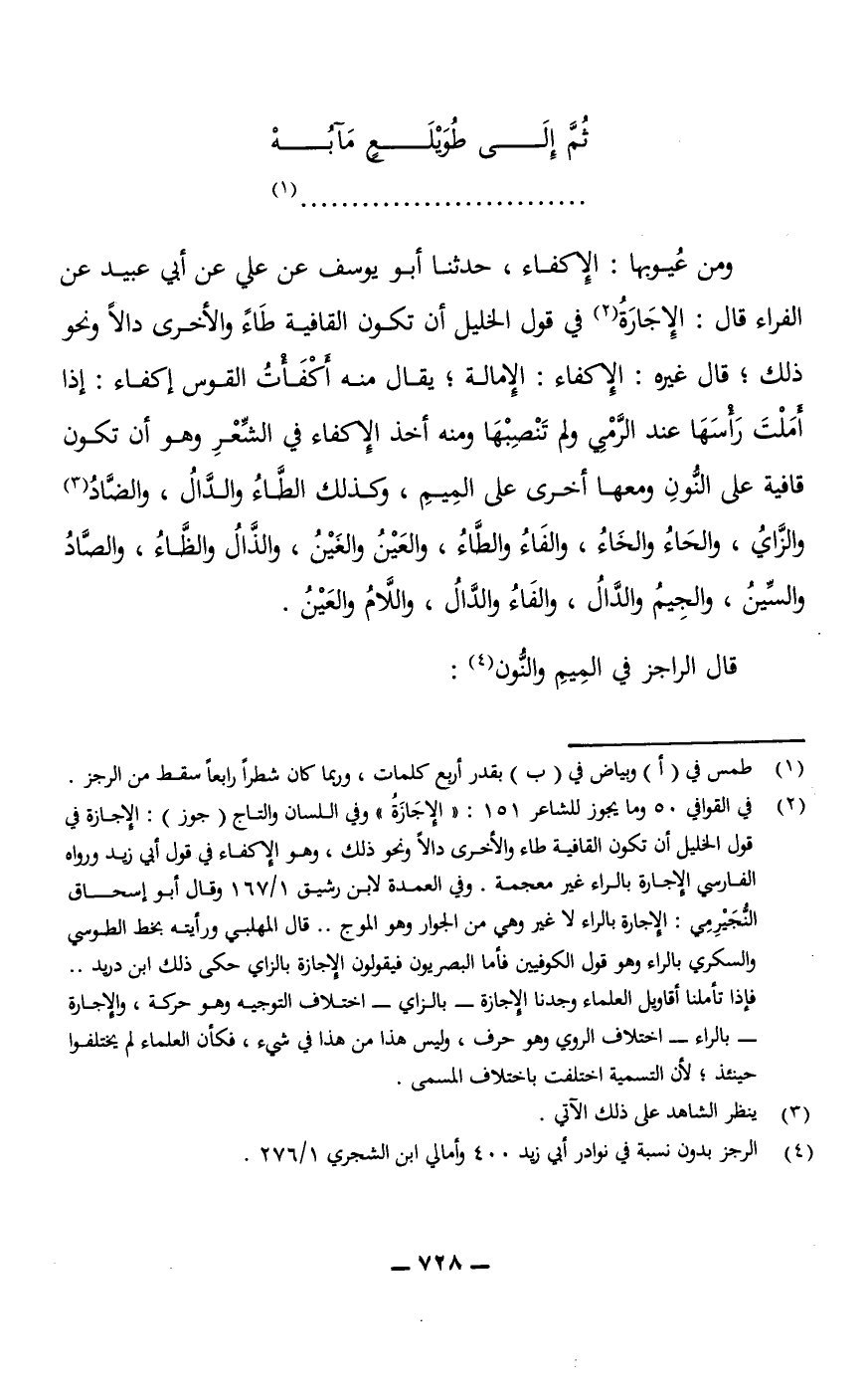 ومن عُيوبها: الإكفاء، حدثنا أبو يوسف، عن علي، عن أبي عبيد، عن الفراء، قال: الإِجَارَةُ في قول الخليل أن تكون القافية طَاءً والأخرى دالًا ونحو ذلك؛ قال غيره: الإكفاء: الإمالة؛ يقال منه أَكْفَاتُ القوس إكفاء: إذا أَمَلْتَ رَاسَهَا عند الرَّمْيِ ولم تَنْصِبْهَا ومنه أخذ الإكفاء في الشِّعْرِ وهو أن تكون قافية على النُّونِ ومعها أخرى على الميم، وكذلك الطَّاءُ والدَّالُ، والضَّادُ والزَّايُ، والحَاءُ والخَاءُ، والفَاءُ والطَّاءُ، والعَيْنُ والغَيْنُ، والذَّالُ والظَّاءُ، والصَّادُ والسِّينُ، والجِيمُ والدَّالُ، والفَاءُ والدَّالُ، واللَّامُ والعَيْنُ.