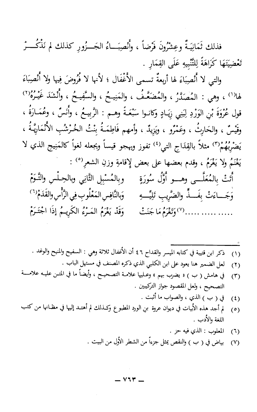 والتي لا أنصباء لها أربعة تسمى الأغْفَال؛ لأنها لا فُروضَ فيها ولا أنصباء لها، وهي المُصَدَّرُ، والمُضَعَّفُ، والمنيح، والسفيح، وأنشد غيره قول عُرْوَةَ بنِ الوَرْدِ لِبَني زِيَادٍ وكانوا سبعة وهم: الرَّبِيعُ، وأَنَسٌ، وعُمارة، وقَيس، والحارث، وعمرو، ويَزِيد، وأمهم فاطمة بنت الخُرْشُبِ الأَنْمَارِيَّةُ، يَضْربُهُمْ مثلًا بالقِدَاحِ التي تفوز ويهجو قيسًا ويجعله لغوًا كالمَنِيحِ الذي لا يَغْنَمُ ولا يَغْرَمُ، وقدم بعضها على بعض لإقامة وزن الشعر: