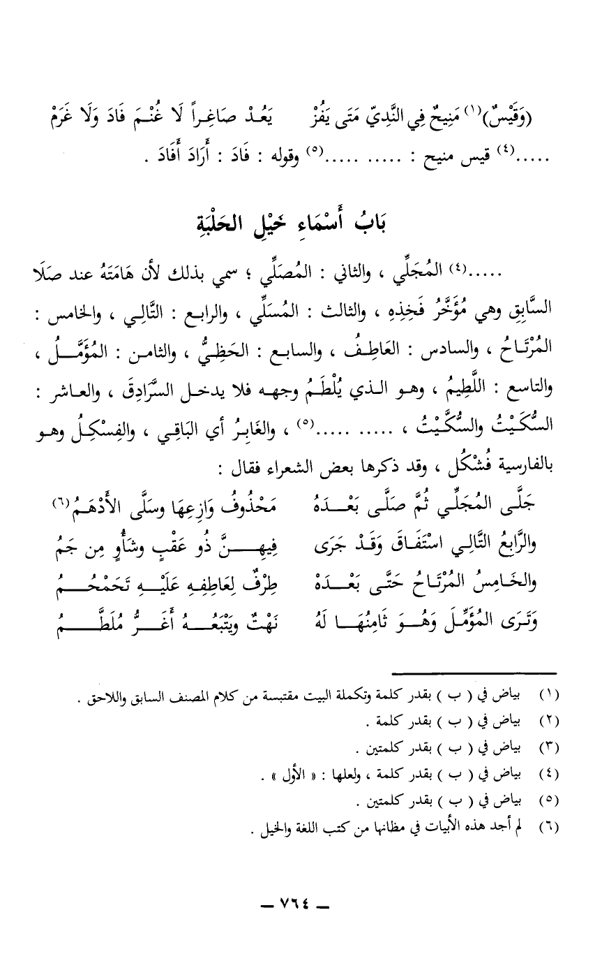. المُجَلِّي، والثاني: المُصَلِّي؛ سمي بذلك لأن هَامَتَهُ عند صَلَا السَّابِقِ وهي مُؤَخَّرُ فَخِذِه، والثالث: المُسَلِّي، والرابع: التَّالِي، والخامس: المُرْتَاحُ، والسادس: العاطف، والسابع: الحَظِيُّ، والثامن: المُؤَمَّلُ، والتاسع: اللَّطِيمُ، وهو الذي يُلْطَمُ وجهه فلا يدخل السَّرَادِقَ، والعاشر: السُّكَيْتُ والسُّكَّيْتُ، ...... ، والغابر؛ أي: الباقي، والفِسْكِلُ وهو بالفارسية فُشْكُل، وقد ذكرها بعض الشعراء، فقال: