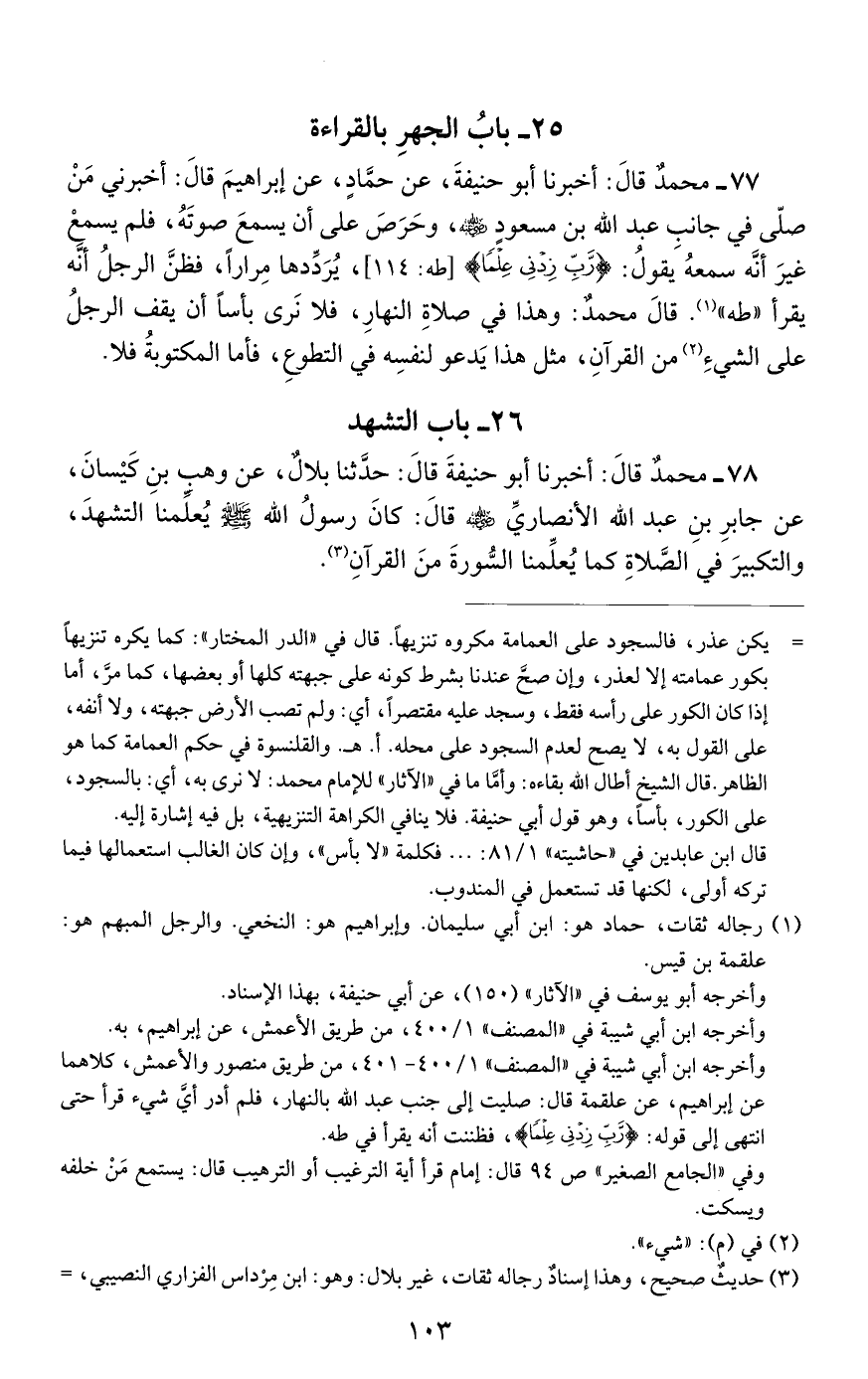 77 - مُحَمَّدٌ، قَالَ: أَخْبَرَنَا أَبُو حَنِيفَةَ، عَنْ حَمَّادٍ، عَنْ إِبْرَاهِيمَ، قَالَ أَخْبَرَني مَنْ صَلَّى في جَانِبِ عَبْدِ اللَّهِ بْنِ مَسْعُودٍ رَضِيَ اللَّهُ عَنْهُ وَحَرَصَ عَلَى أَنْ يَسْمَعَ صَوْتَهُ فَلَمْ يَسْمَعْ غَيْرَ أَنَّهُ سَمِعَهُ يَقُولُ: {رَبِّ زِدْنِي عِلْمًا} [طه: 114] يُرَدِّدُهَا مِرَارًا، فَظَنَّ الرَّجُلُ أَنَّهُ يَقْرَأُ طَهْ "