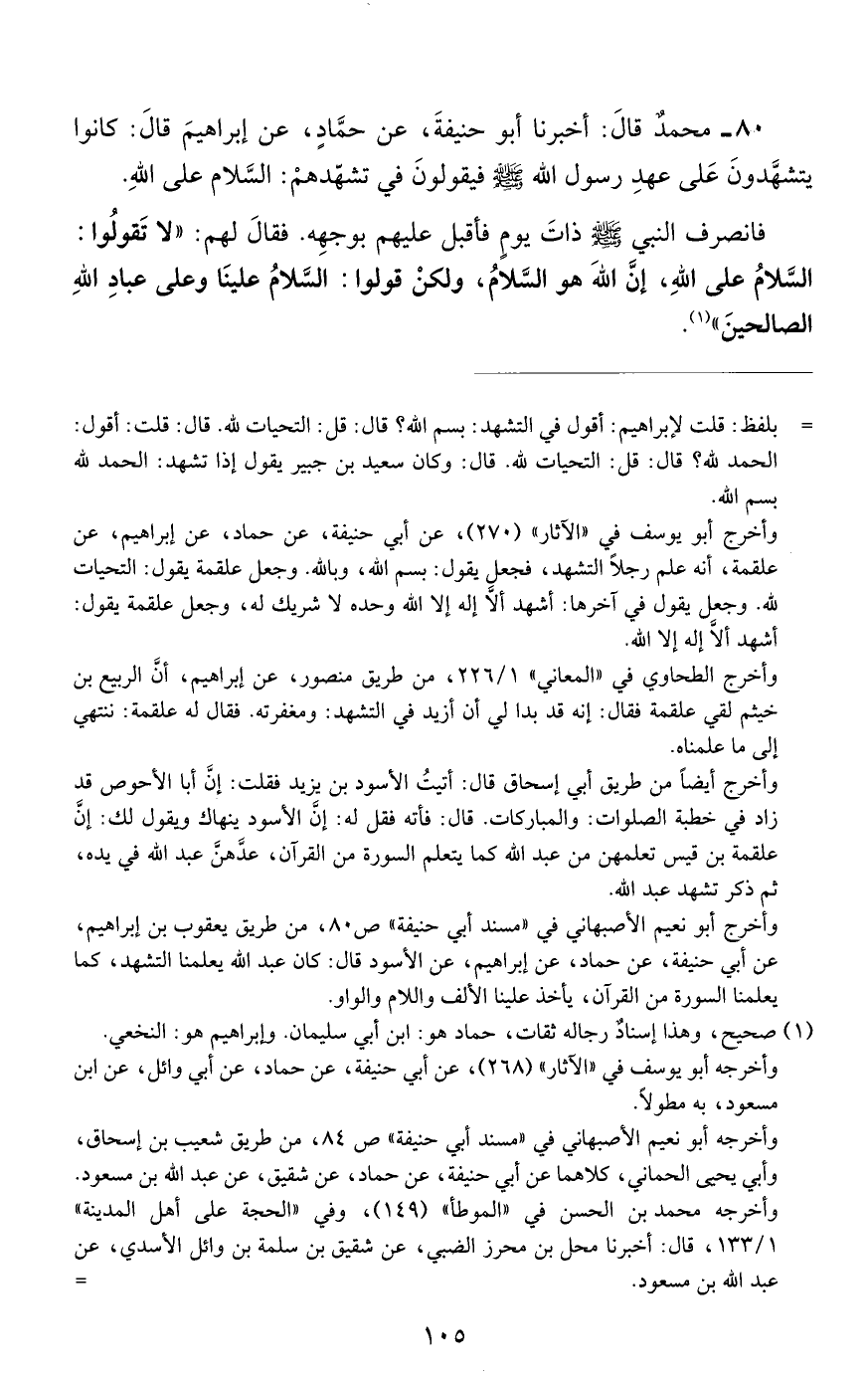 80 - مُحَمَّدٌ، قَالَ: أَخْبَرَنَا أَبُو حَنِيفَةَ، عَنْ حَمَّادٍ، عَنْ إِبْرَاهِيمَ، قَالَ: كَانُوا يَتَشَهَّدُونَ عَلَى عَهْدِ رَسُولِ اللَّهِ صَلَّى اللهُ عَلَيْهِ وَسَلَّمَ فَيَقُولُونَ فِي تَشُهُّدِهِمُ السَّلَامُ عَلَى اللَّهِ. فَانْصَرَفَ النَّبِيُّ صَلَّى اللهُ عَلَيْهِ وَسَلَّمَ ذَاتَ يَوْمٍ فَأَقْبَلَ عَلَيْهِمْ بِوَجْهِهِ فَقَالَ لَهُمْ: " لَا تَقُولُوا السَّلَامُ عَلَى اللَّهِ؛ إِنَّ اللَّهَ هُوَ السَّلَامُ، وَلَكِنْ قُولُوا: السَّلَامُ عَلَيْنَا وَعَلَى عِبَادِ اللَّهِ الصَّالِحِينَ "