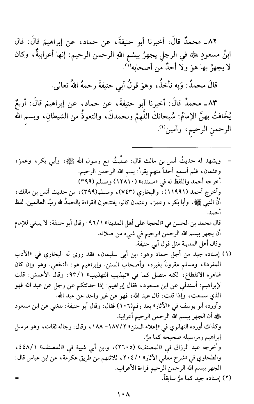 82 - مُحَمَّدٌ، قَالَ: أَخْبَرَنَا أَبُو حَنِيفَةَ، عَنْ حَمَّادٍ، عَنْ إِبْرَاهِيمَ، قَالَ: قَالَ ابْنُ مَسْعُودٍ رَضِيَ اللَّهُ عَنْهُ فِي الرَّجُلِ يَجْهَرُ بِبِسْمِ اللَّهِ الرَّحْمَنِ الرَّحِيمِ: «إِنَّهَا أَعْرَابِيَّةٌ، وَكَانَ لَا يَجْهَرُ بِهَا هُوَ، وَلَا أَحَدٌ مِنْ أَصْحَابِهِ»
