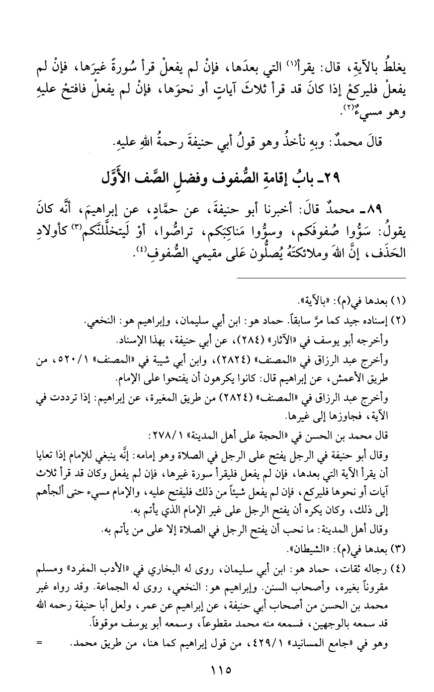 89 - مُحَمَّدٌ، قَالَ: أَخْبَرَنَا أَبُو حَنِيفَةَ، عَنْ حَمَّادٍ، عَنْ إِبْرَاهِيمَ، أَنَّهُ كَانَ يَقُولُ «سَوُّوا صُفُوفَكُمْ، وَسَوُّوا مَنَاكِبَكُمْ، تَرَاصُّوا أَوْ لَيَتَخَلَّلَنَّكُمُ كَأَوْلَادِ الْحَذَفِ، إِنَّ اللَّهَ وَمَلَائِكَتَهُ يُصَلُّونَ عَلَى مُقِيمِي الصُّفُوفِ»