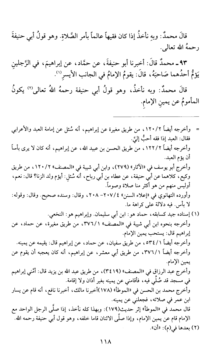 93 - مُحَمَّدٌ، قَالَ: أَخْبَرَنَا أَبُو حَنِيفَةَ، عَنْ حَمَّادٍ، عَنْ إِبْرَاهِيمَ فِي " الرَّجُلَيْنِ يَؤُمُّ أَحَدُهُمَا صَاحِبَهُ. قَالَ: «يَقُومُ الْإِمَامُ فِي الْجَانِبِ الْأَيْسَرِ»