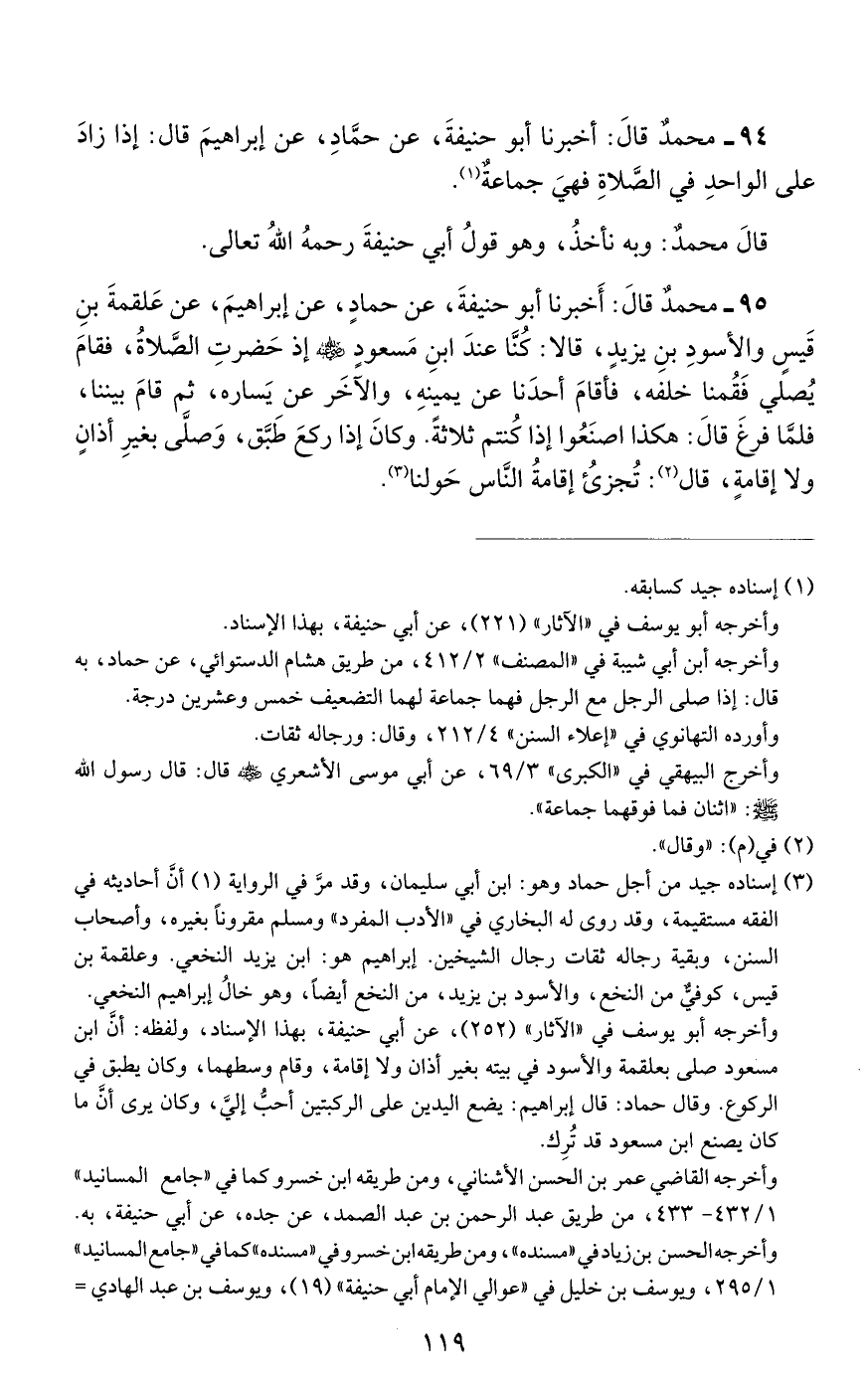 94 - مُحَمَّدٌ، قَالَ: أَخْبَرَنَا أَبُو حَنِيفَةَ، عَنْ حَمَّادٍ، عَنْ إِبْرَاهِيمَ، قَالَ: «إِذَا زَادَ عَلَى الْوَاحِدِ فِي الصَّلَاةِ فَهِيَ جَمَاعَةٌ»