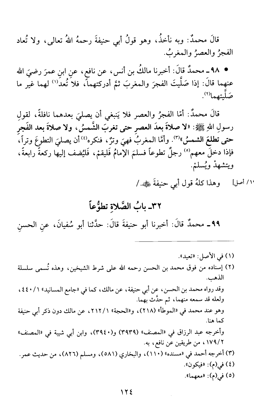 98 - مُحَمَّدٌ، قَالَ: أَخْبَرَنا مَالِكُ بْنُ أَنَسٍ، عَنْ نَافِعٍ، عَنِ ابْنِ عُمَرَ رَضِيَ اللَّهُ عَنْهُمَا قَالَ: «إِذَا صَلَّيْتَ الْفَجْرَ وَالْمَغْرِبَ ثُمَّ أَدْرَكْتَهُمَا فَلَا تَعُدْ لَهُمَا غَيْرَ مَا صَلَّيْتَهُمَا»