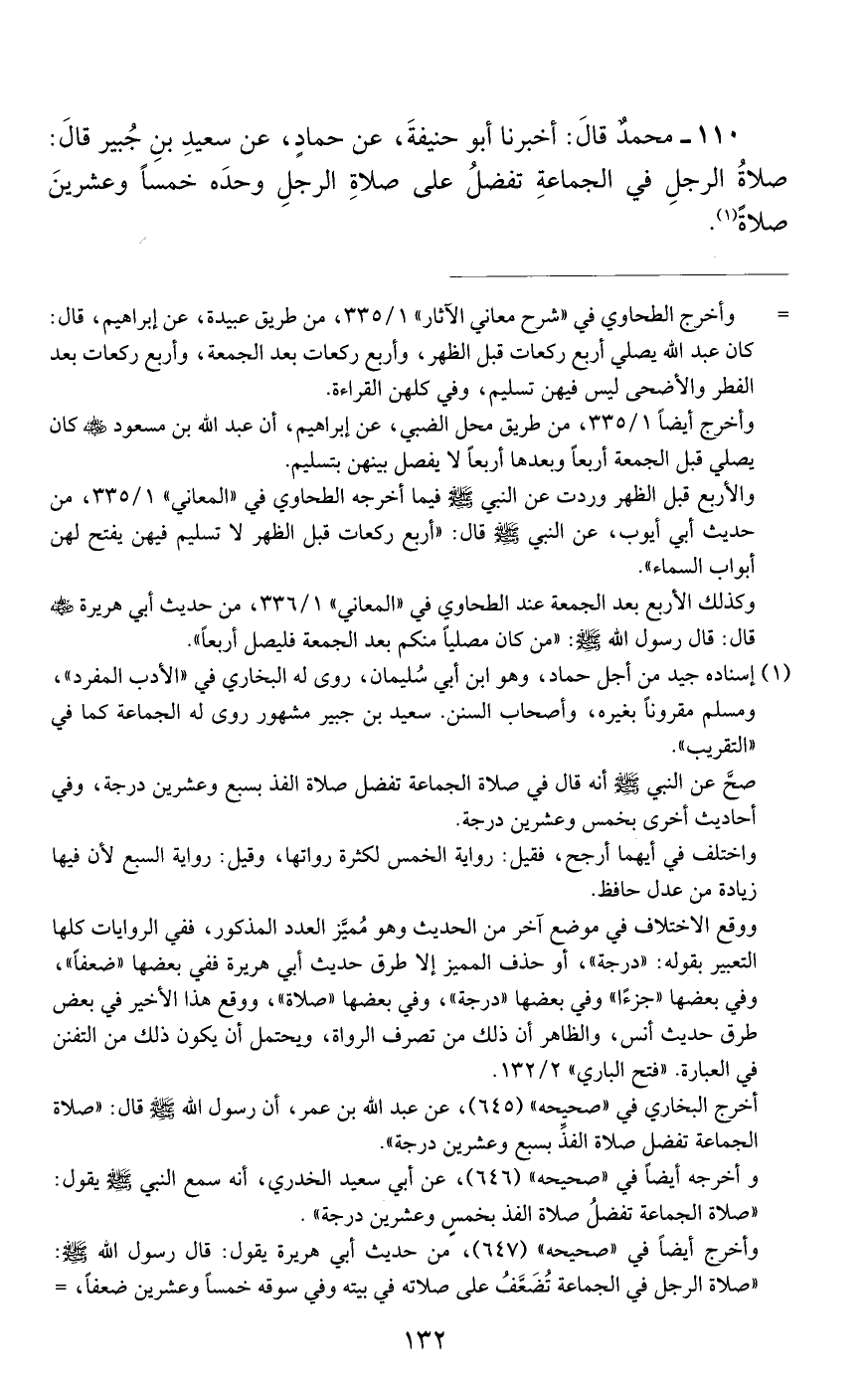 110 - مُحَمَّدٌ، قَالَ: أَخْبَرَنَا أَبُو حَنِيفَةَ، عَنْ حَمَّادٍ، عَنْ سَعِيدِ بْنِ جُبَيْرٍ، قَالَ: «صَلَاةُ الرَّجُلِ فِي الْجَمَاعَةِ تَفْضُلُ عَلَى صَلَاةِ الرَّجُلِ وَحْدَهُ خَمْسًا وَعِشْرِينَ صَلَاةً»