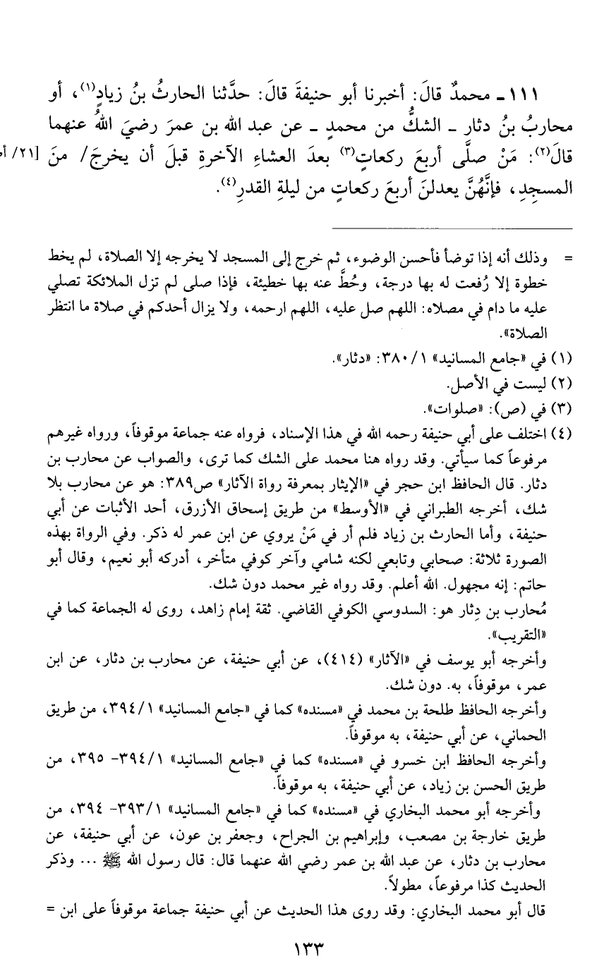 111 - مُحَمَّدٌ، قَالَ: أَخْبَرَنَا أَبُو حَنِيفَةَ، قَالَ حَدَّثَنَا الْحَارِثُ بْنُ زِيَادٍ أَوْ مُحَارِبُ بْنُ دِثَارٍ - الشَّكُّ مِنْ مُحَمَّدٍ - عَنْ عَبْدِ اللَّهِ بْنِ عُمَرَ رَضِيَ اللَّهُ عَنْهُمَا قَالَ: «مَنْ صَلَّى أَرْبَعَ رَكَعَاتٍ بَعْدَ الْعِشَاءِ الْآخِرَةِ قَبْلَ أَنْ يَخْرُجَ مِنَ الْمَسْجِدِ فَإِنَّهُنَّ يَعْدِلْنَ أَرْبَعَ رَكَعَاتٍ مِنْ لَيْلَةِ الْقَدْرِ»