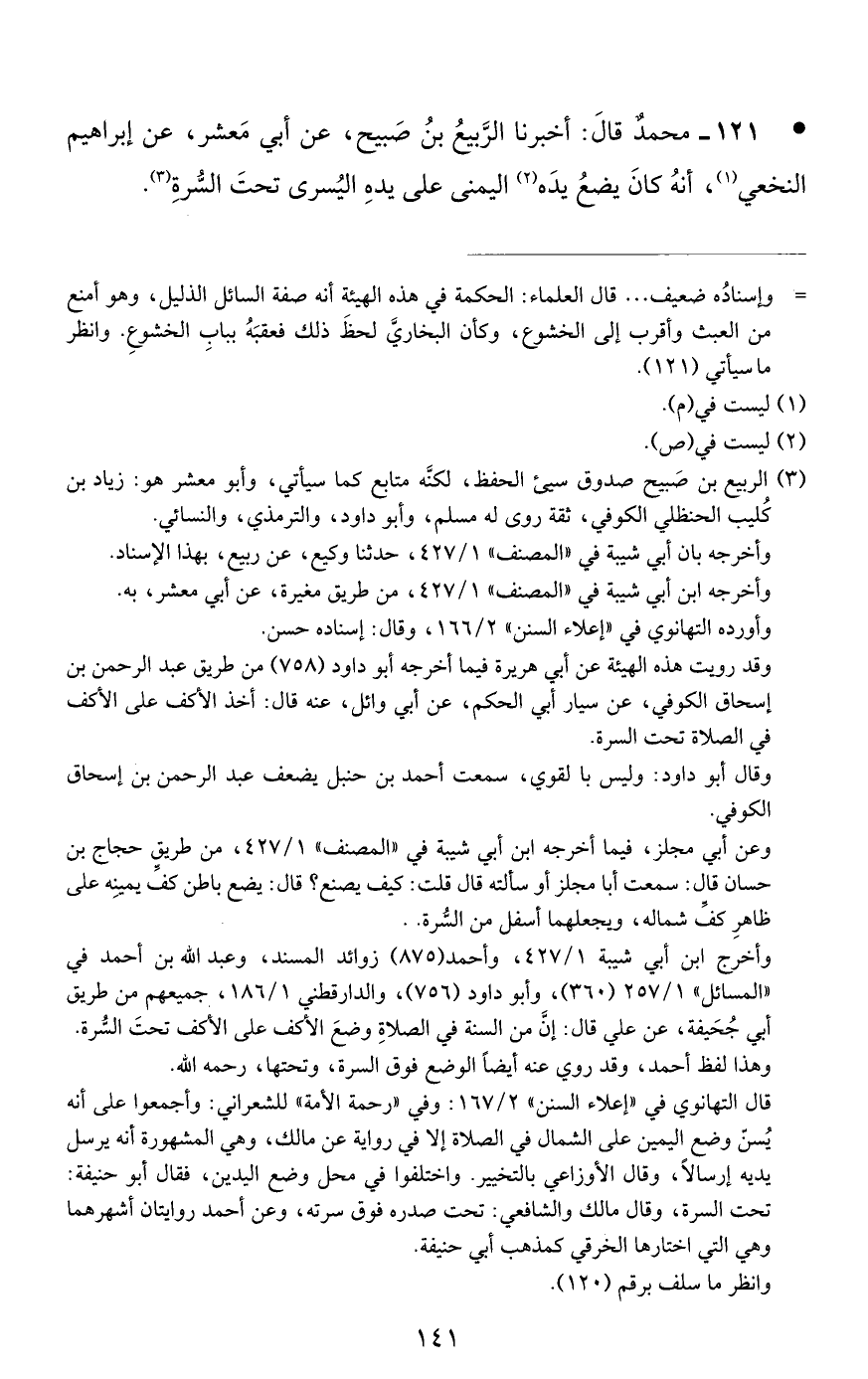 121 - مُحَمَّدٌ، قَالَ: أَخْبَرَنَا الرَّبِيعُ بْنُ صُبَيْحٍ، عَنْ أَبِي مَعْشَرَ، عَنْ إِبْرَاهِيمَ النَّخَعِيِّ أَنَّهُ كَانَ يَضَعُ يَدَهُ الْيُمْنَى عَلَى يَدِهِ الْيُسْرَى تَحْتَ السُّرَّةِ
