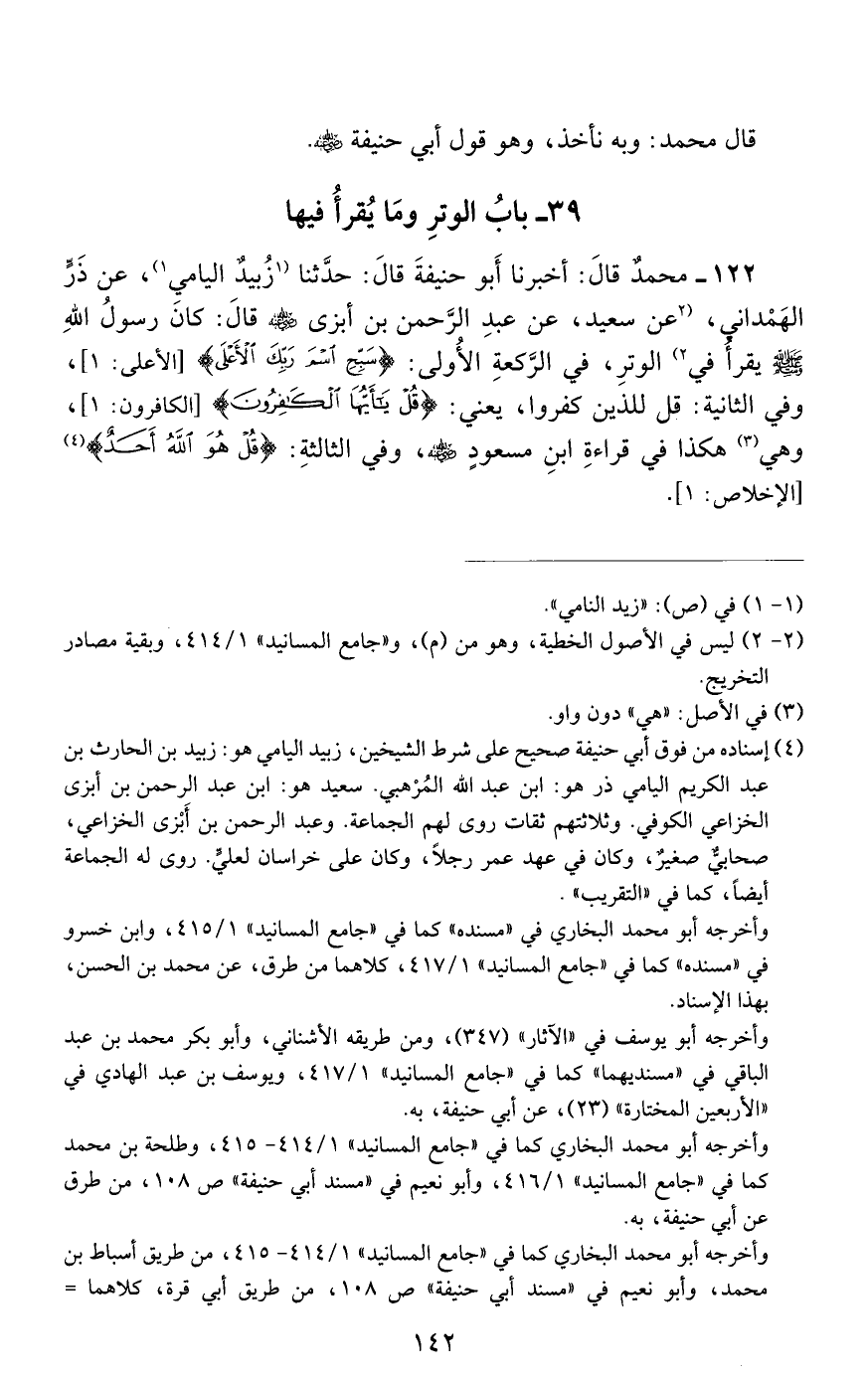 122 - مُحَمَّدٌ، قَالَ: أَخْبَرَنَا أَبُو حَنِيفَةَ، قَالَ حَدَّثَنَا زُبَيْدٌ الْيَامِيُّ، عَنْ ذَرٍّ الْهَمْدَانِيِّ، عَنْ سَعِيدٍ، عَنْ عَبْدِ الرَّحْمَنِ بْنِ أَبْزَى رَضِيَ اللَّهُ عَنْهُ قَالَ: «كَانَ رَسُولُ اللَّهِ صَلَّى اللهُ عَلَيْهِ وَسَلَّمَ يَقْرَأُ فِي الْوِتْرِ فِي الرَّكْعَةِ الْأُولَى: سَبِّحِ اسْمَ رَبِّكَ الْأَعْلَى، وَفِي الثَّانِيَةِ» قُلْ لِلَّذِينَ كَفَرُوا «يَعْنِي قُلْ يَا أَيُّهَا الْكَافِرُونَ وَهِيَ هَكَذَا فِي قِرَاءَةِ ابْنِ مَسْعُودٍ رَضِيَ اللَّهُ عَنْهُ، وَفِي الثَّالِثَةِ قُلْ هُوَ اللَّهُ أَحَدٌ»