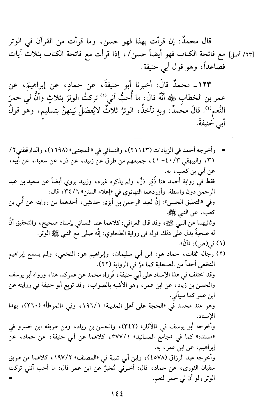 123 - مُحَمَّدٌ، قَالَ: أَخْبَرَنَا أَبُو حَنِيفَةَ، عَنْ حَمَّادٍ، عَنْ إِبْرَاهِيمَ، عَنْ عُمَرَ بْنِ الْخَطَّابِ رَضِيَ اللَّهُ عَنْهُ، أَنَّهُ قَالَ: «مَا أُحِبُّ أَنِّي تَرَكْتُ الْوِتْرَ بِثَلَاثٍ، وَإِنَّ لِي حُمْرَ النَّعَمِ»