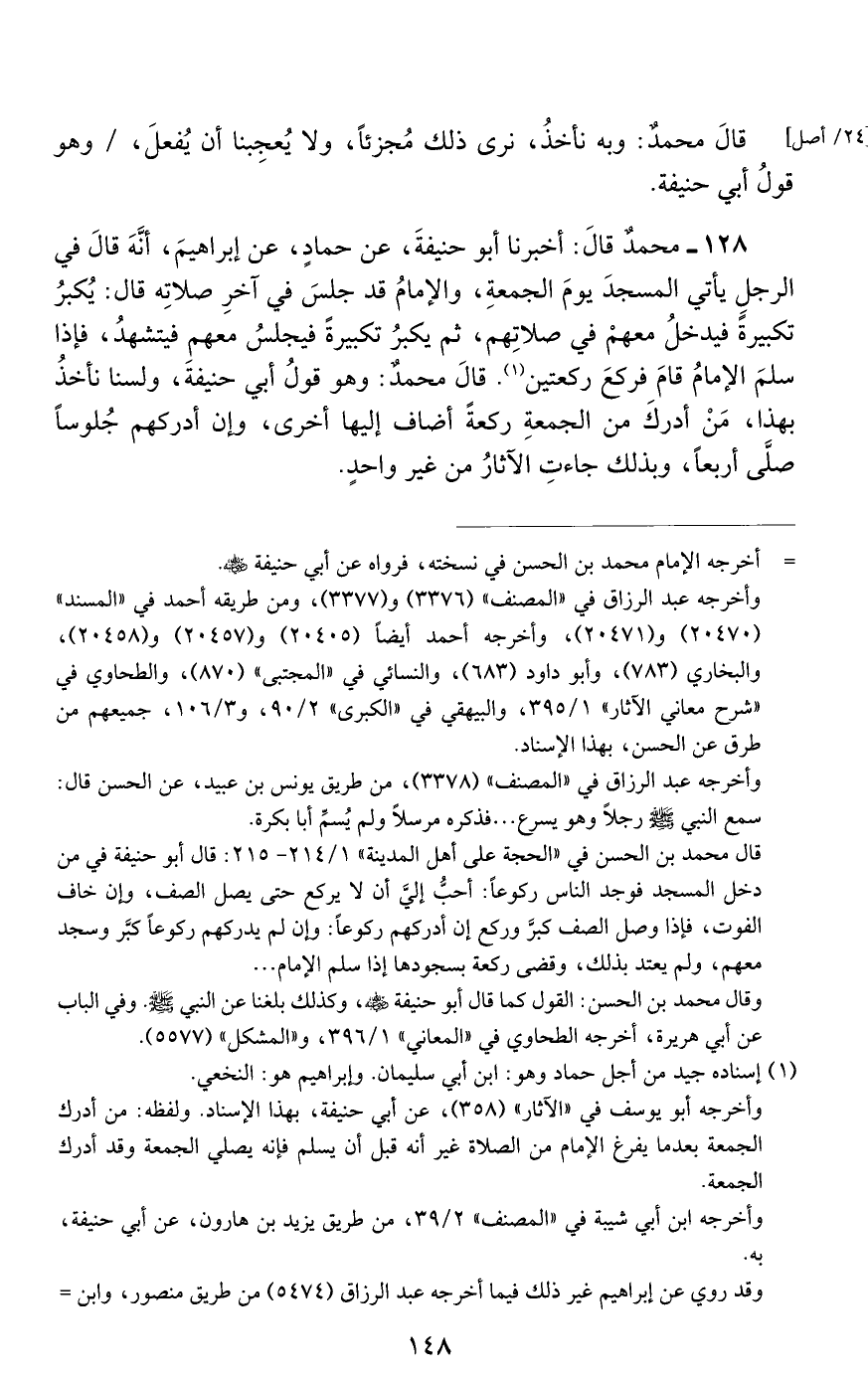 128 - مُحَمَّدٌ، قَالَ: أَخْبَرَنَا أَبُو حَنِيفَةَ، عَنْ حَمَّادٍ، عَنْ إِبْرَاهِيمَ أَنَّهُ قَالَ فِي الرَّجُلِ يَأْتِي الْمَسْجِدَ يَوْمَ الْجُمُعَةِ، وَالْإِمَامُ قَدْ جَلَسَ فِي آخِرِ صَلَاتِهِ، قَالَ: «يُكَبِّرُ تَكْبِيرَةً، فَيَدْخُلُ مَعَهُمْ فِي صَلَاتِهِمْ، ثُمَّ يُكَبِّرُ تَكْبِيرَةً، فَيَجْلِسُ مَعَهُمْ فَيَتَشَهَّدُ، فَإِذَا سَلَّمَ الْإِمَامُ، قَامَ فَرَكَعَ رَكْعَتَيْنِ»