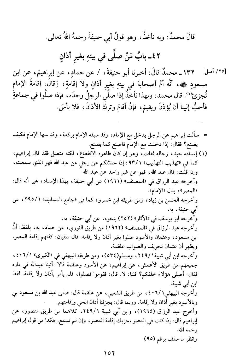 132 - مُحَمَّدٌ، قَالَ: أَخْبَرَنَا أَبُو حَنِيفَةَ، عَنْ حَمَّادٍ، عَنْ إِبْرَاهِيمَ، عَنِ ابْنِ مَسْعُودٍ رَضِيَ اللَّهُ عَنْهُ أَنَّهُ أَمَّ أَصْحَابَهُ فِي بَيْتِهِ بِغَيْرِ أَذَانٍ وَلَا إِقَامَةٍ، وَقَالَ: إِقَامَةُ الْإِمَامِ تُجْزِئُ "