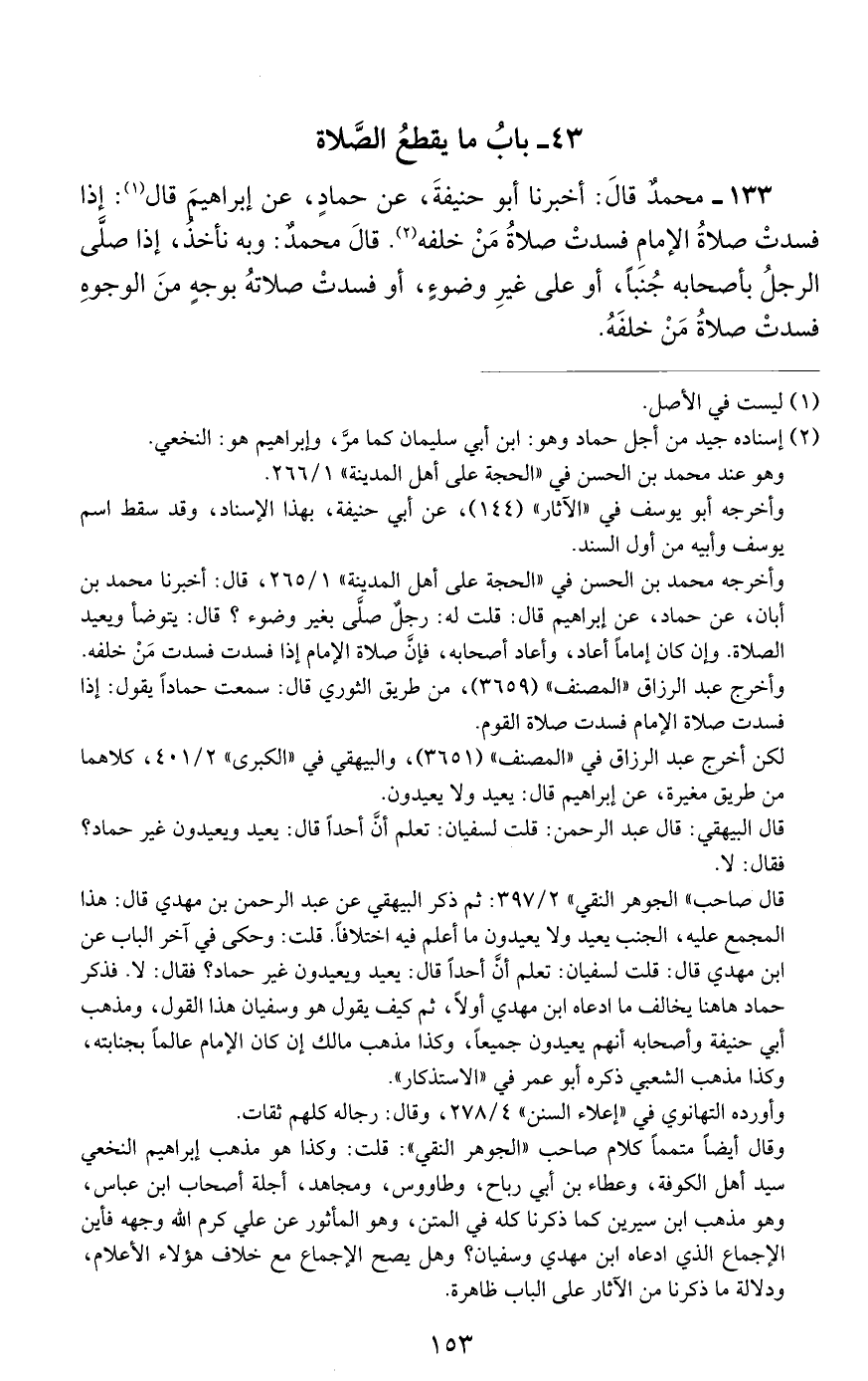 133 - مُحَمَّدٌ، قَالَ: أَخْبَرَنَا أَبُو حَنِيفَةَ، عَنْ حَمَّادٍ، عَنْ إِبْرَاهِيمَ، قَالَ: «إِذَا فَسَدَتْ صَلَاةُ الْإِمَامِ فَسَدَتْ صَلَاةُ مَنْ خَلْفَهُ»